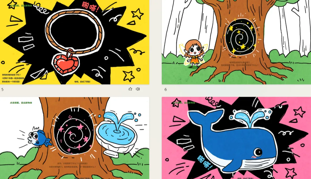 l尝试运用固定句式“大树大树快开门,XX和XX丢进洞,啪嗒,变成……”进行大胆猜想与仿编。