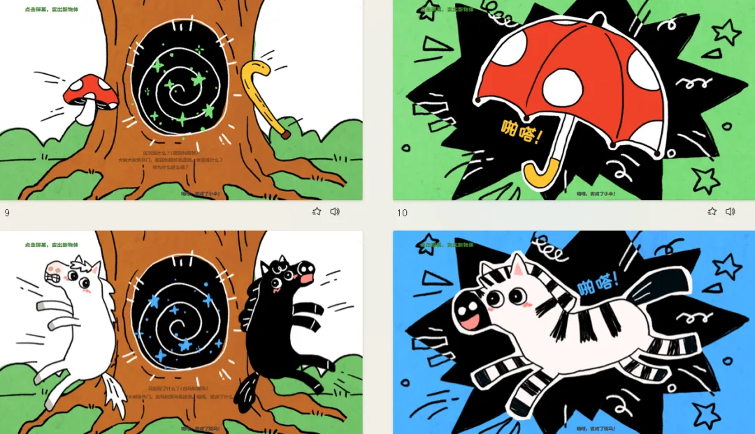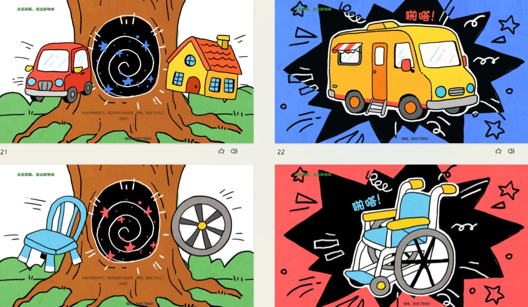小中班幼儿正处于语言发展的关键期,他们对新奇、有趣的事物充满好奇,喜欢模仿重复性的语言,也乐于在游戏中表达自己。《啪嗒,变一变》是一本充满童趣和想象力的绘本,它通过“神奇树洞”这一媒介,将两个看似不相关的物品巧妙组合,变出一个全新的、融合了二者特点的新事物。这种“变魔术”般的神奇效果,非常符合幼儿的认知特点和兴趣点,能极大地激发他们的阅读兴趣和参与热情。同时,绘本中重复出现的魔法口令句式简单、节奏感强、朗朗上口,非常适合幼儿学习和模仿。因此,我设计了本次活动,旨在引导幼儿在轻松愉快的阅读和游戏氛围中,初步感知事物组合变化的有趣现象,尝试学说固定句式,体验语言游戏带来的快乐。