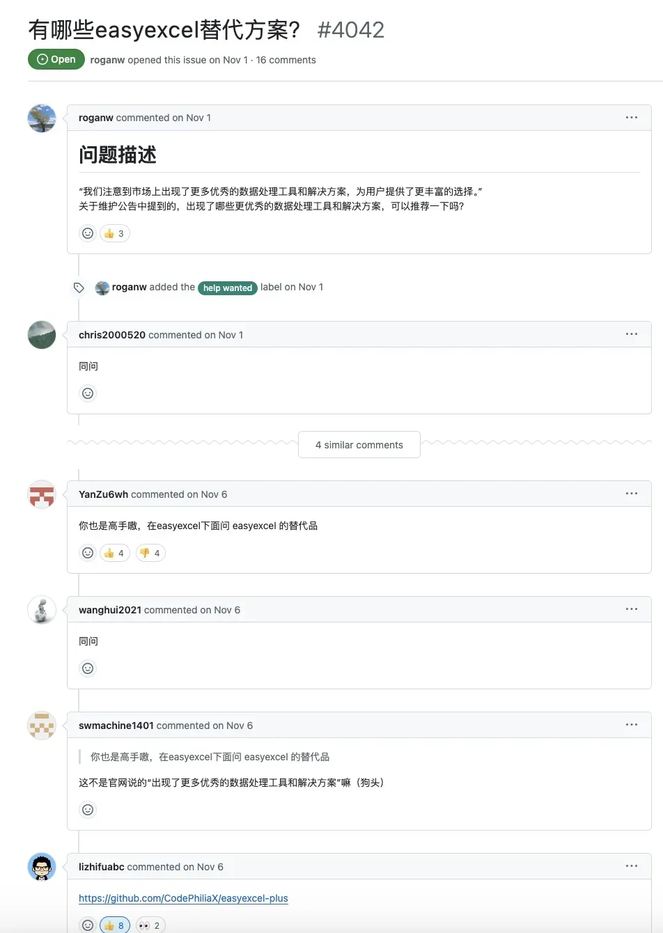 阿里宣布停止更新 EasyExcel 有俩月了,GitHub 有人问,有什么替代方案