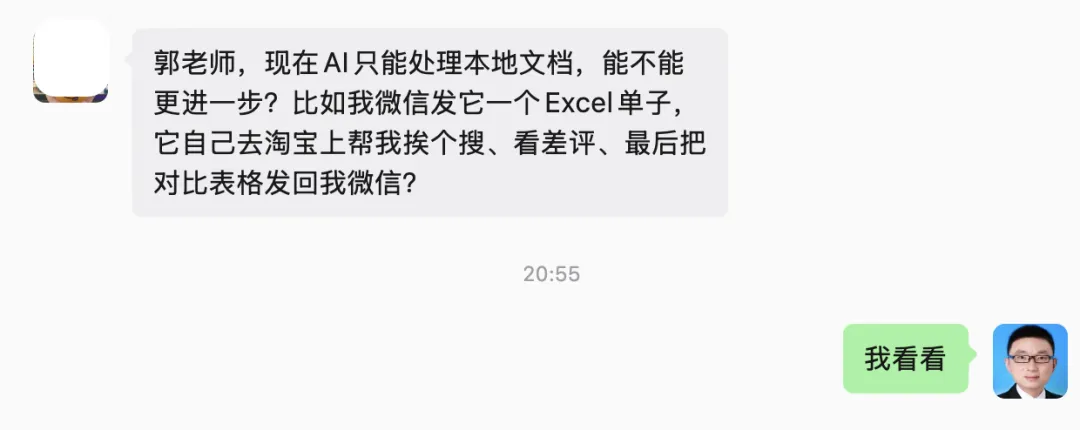 咱们先看效果。整个任务彻底打通了“微信派活 -> Excel自动读取 -> 自动跨软件查询 -> 总结为新表格 -> 微信收工”的全链路。