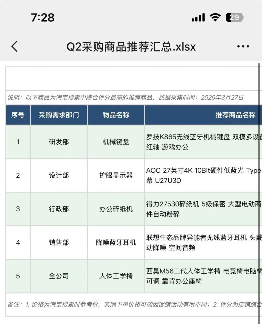 如下所示,在我的电脑微信里,发送一份《Q2部门采购清单.xlsx》文件: