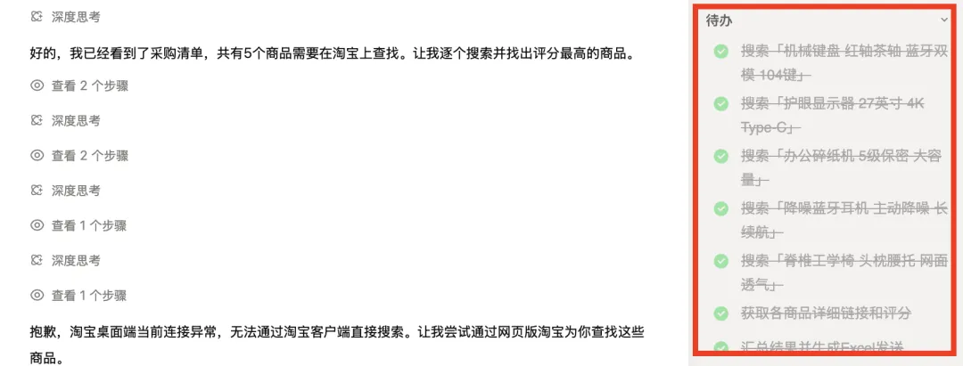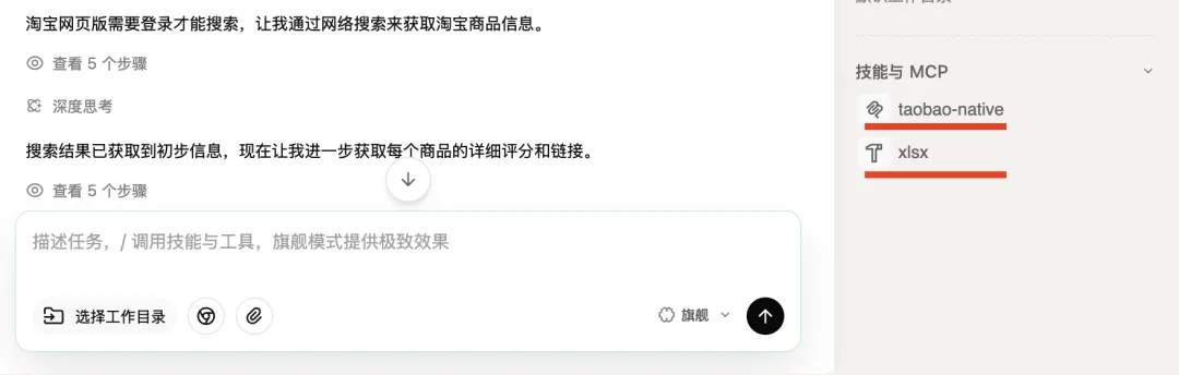 整个干活过程使用的技能与MCP如下,包括taobao-native,实现去软件里搜索商品使用,xlsx是读写Excel的技能: