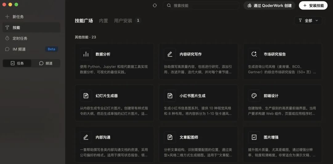 刚才咱们演示了“Excel联动外部软件”的操作,其实 QoderWork 平台还内置了非常多实用的技能Skills,如下图所示:
