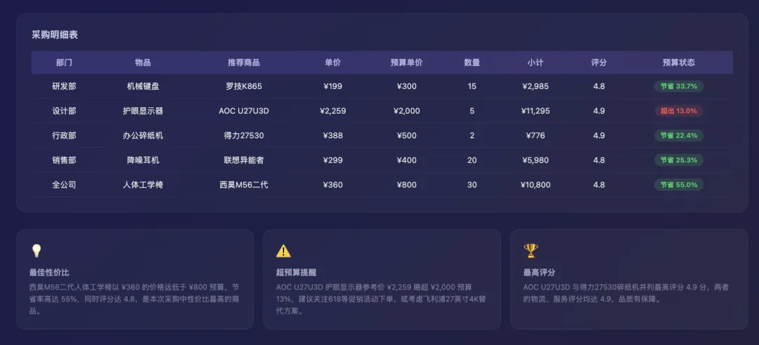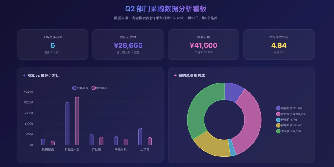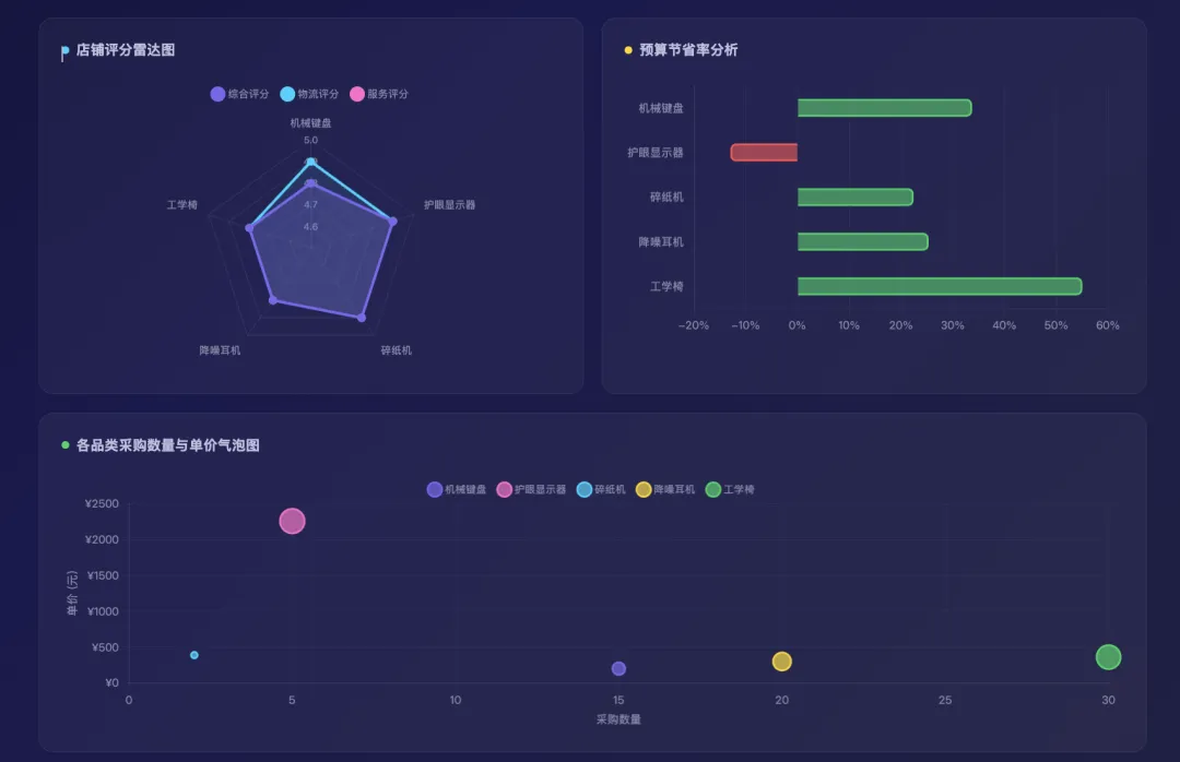 过一会它就自动生成文章开头采购商品的数据可视化,如下这样的一个自动可视化分析网页,打开后显示如下: