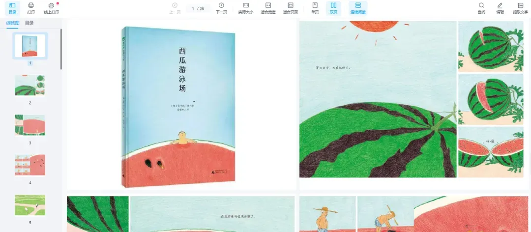 绘本阅读是幼儿教育的重要方式,但许多家长因孩子不识字或价格高而忽视其价值。实际上,绘本通过图文结合能同时刺激儿童的视觉和语言发展。优质绘本能提升儿童的认知、语言和社交能力。长期阅读对学业发展和亲子关系都有积极影响。绘本既是学习工具,也是亲子互动的桥梁。绘本PPT通过丰富多彩的故事和生动的画面,激发幼儿园儿童的学习兴趣,培养他们的阅读能力、想象力和创造力。 绘本PPT电子版画册涵盖了各种主题和风格,包括寓言故事、科普知识、生活常识、人际交往等方面,满足不同年龄段儿童的阅读需求。这些绘本不仅具有丰富的故事情节和精美的插图,还注重文字表达简洁易懂,适合幼儿园儿童阅读和理解。炎炎夏日,一位老爷爷发现了一个裂成了两半的大西瓜。老爷爷把大西瓜变成了清凉的游泳场,大家兴高采烈地往西瓜游泳场跑去,孩子们在泳池里嬉戏打闹,把西瓜皮当作滑滑梯玩,在西瓜叶上练习跳水,将瓜子和西瓜肉做成巨大的雕像……老爷爷和老奶奶也忍不住加入孩子们的队伍。