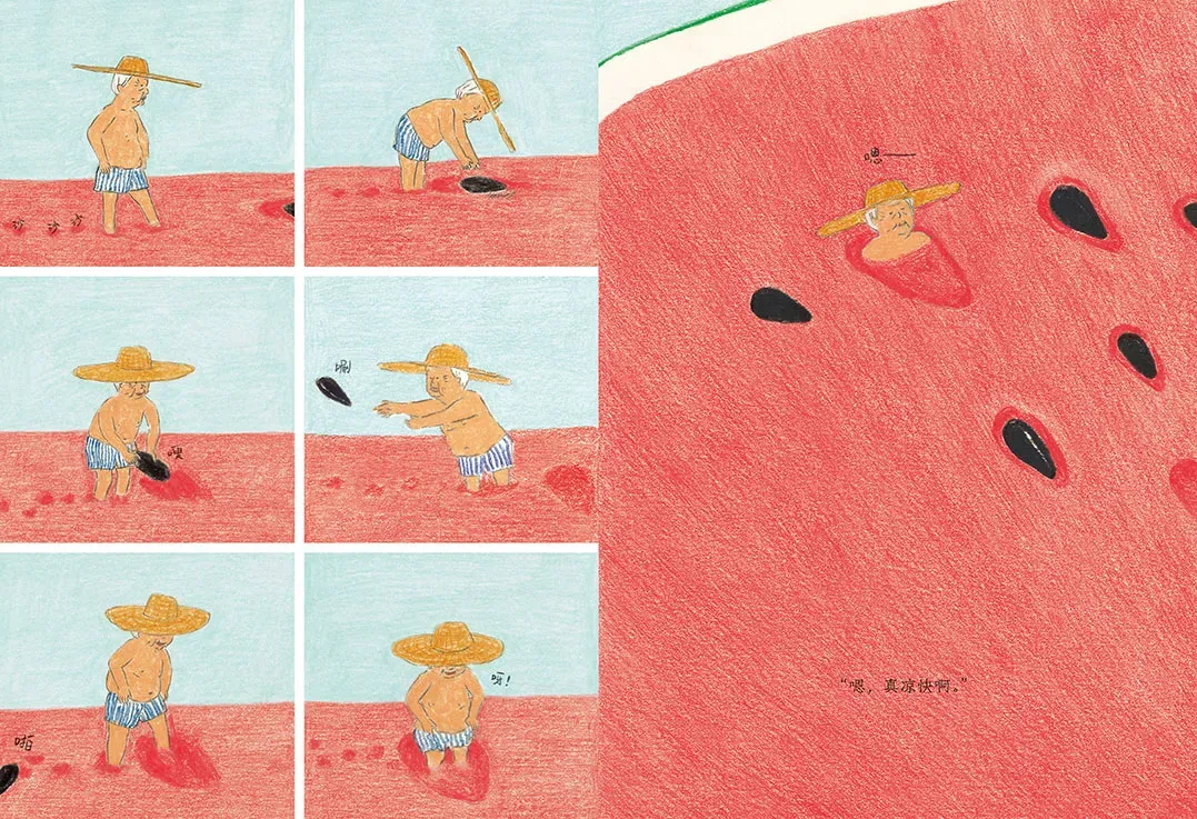 于是老爷爷走进了西瓜游泳场“沙沙沙”,一脚一个脚印走进了西瓜游泳场里。弯下腰,“嗖”一下,拿起了西瓜籽,“唰”一下,往旁边甩了出去,西瓜籽“啪”一下,掉在了不远的地方,老爷爷“呀!”一声,“嗯,真凉快啊!”