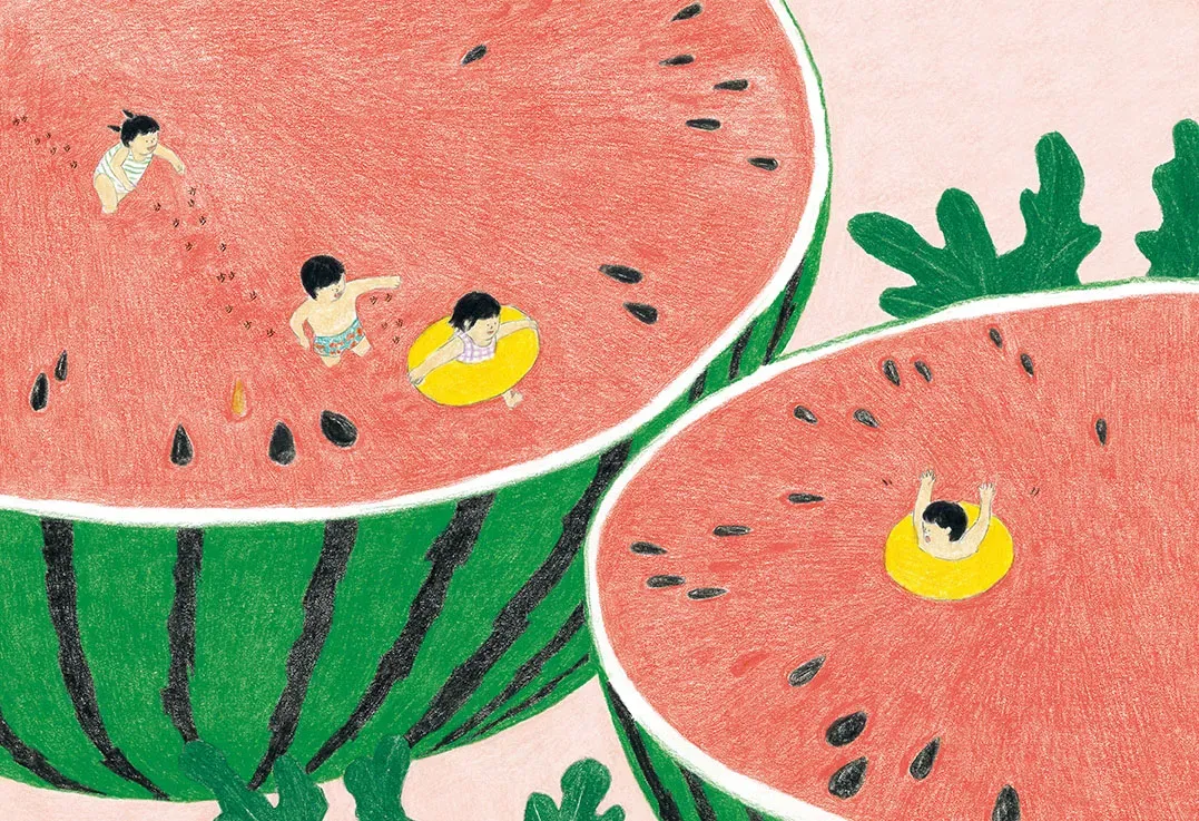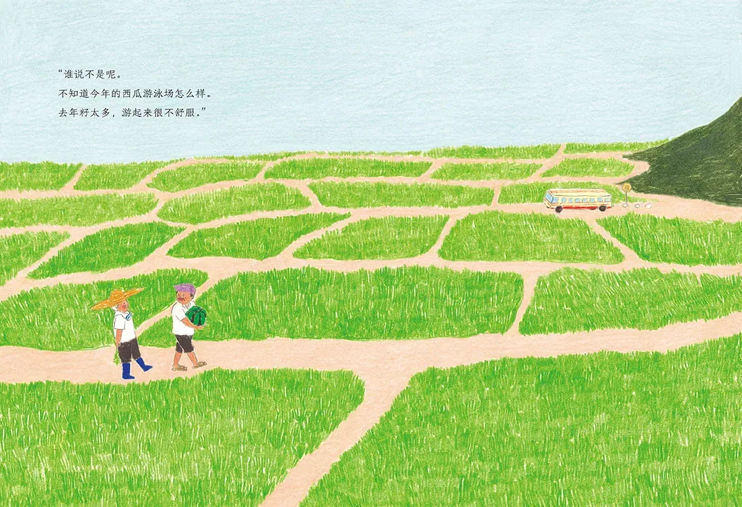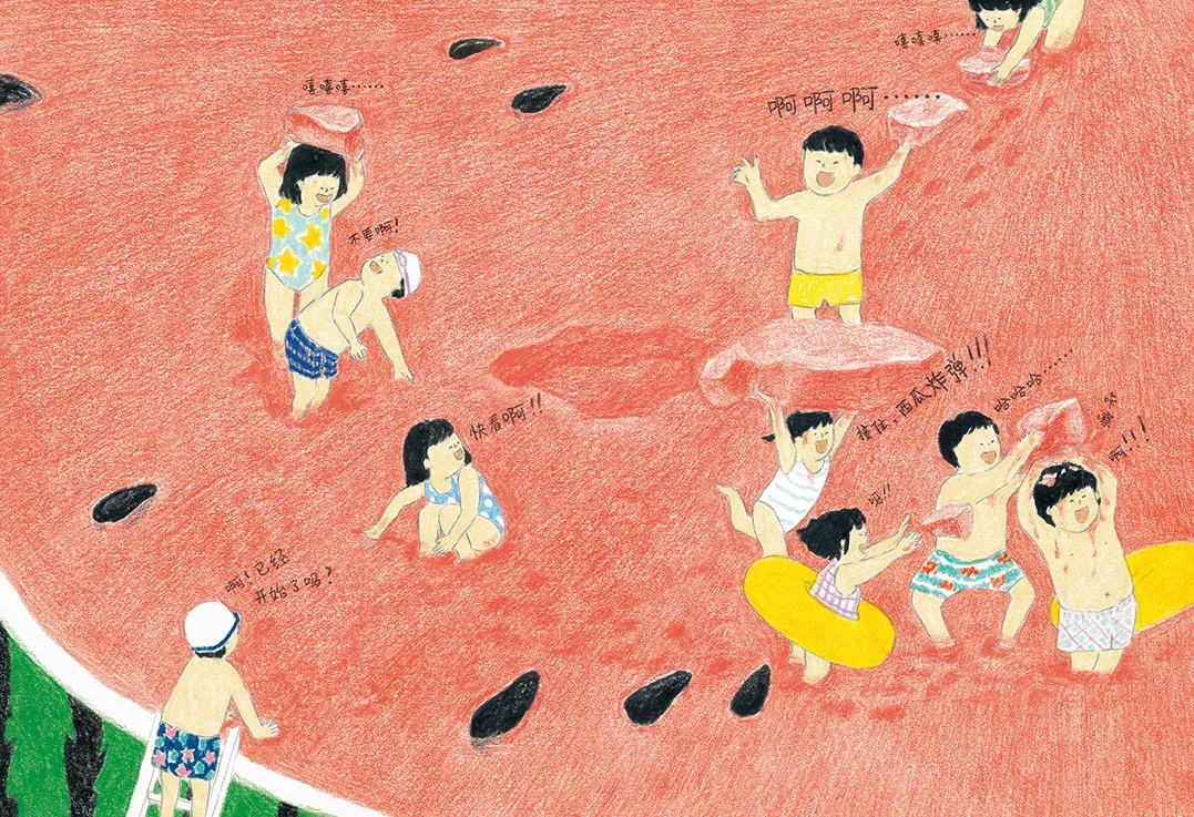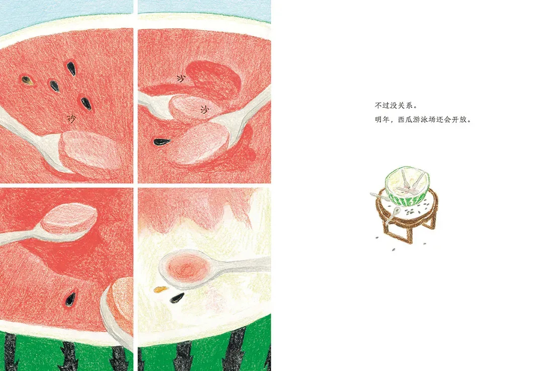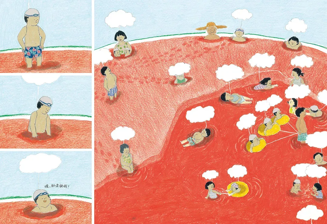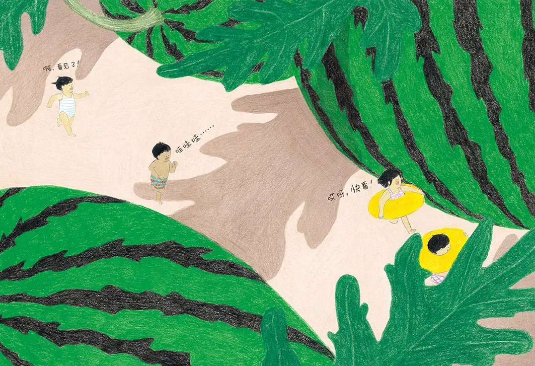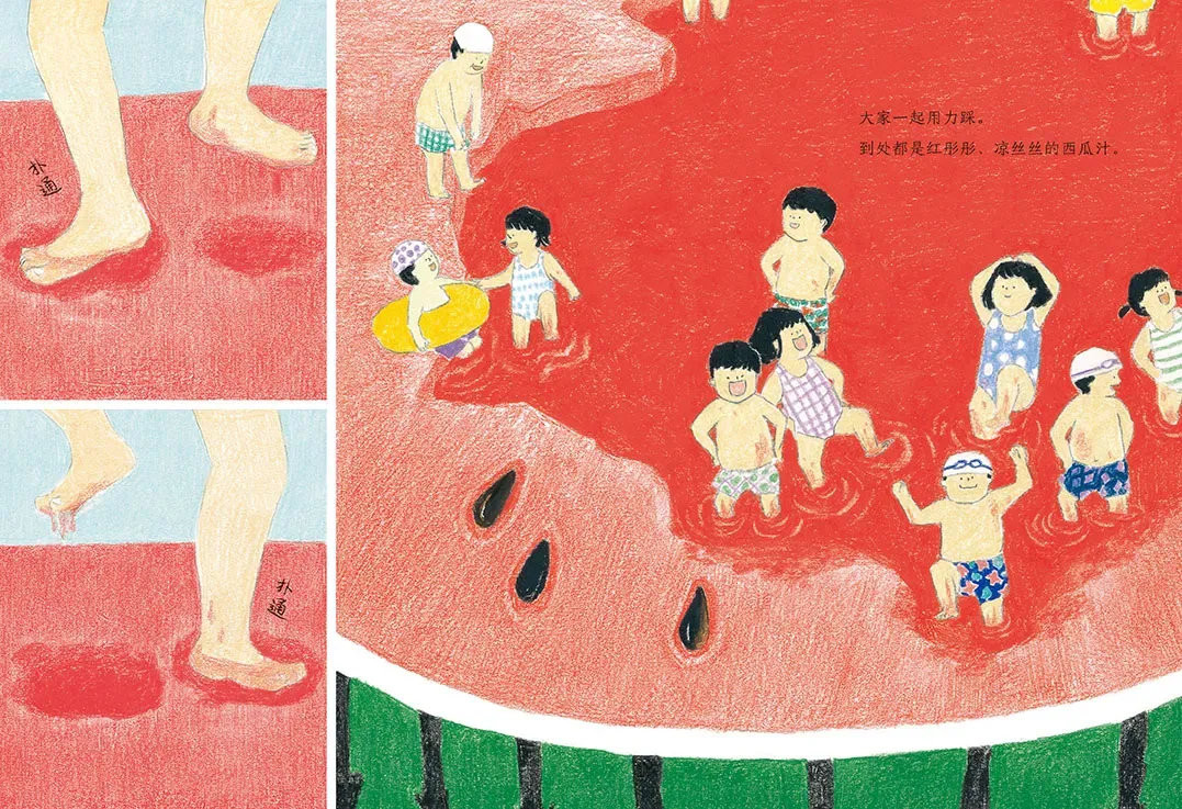 小伙伴们等不及和大家一起了,就快快地跑进了游泳场,脚踩着西瓜发出“沙沙沙”的声响。是快乐的声音也是夏天的声音。