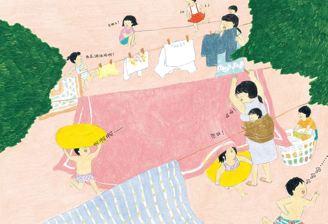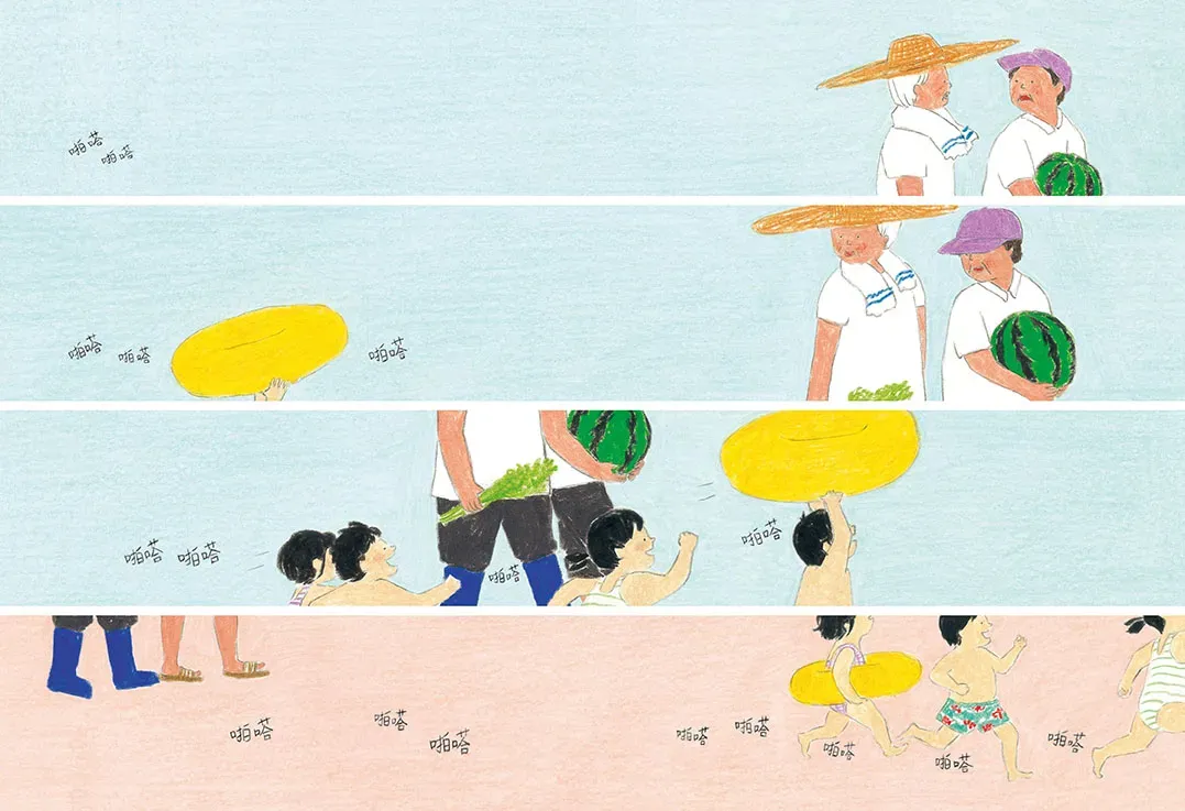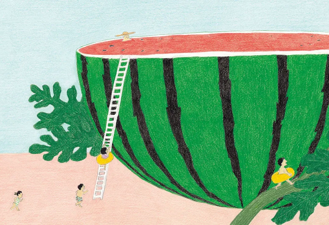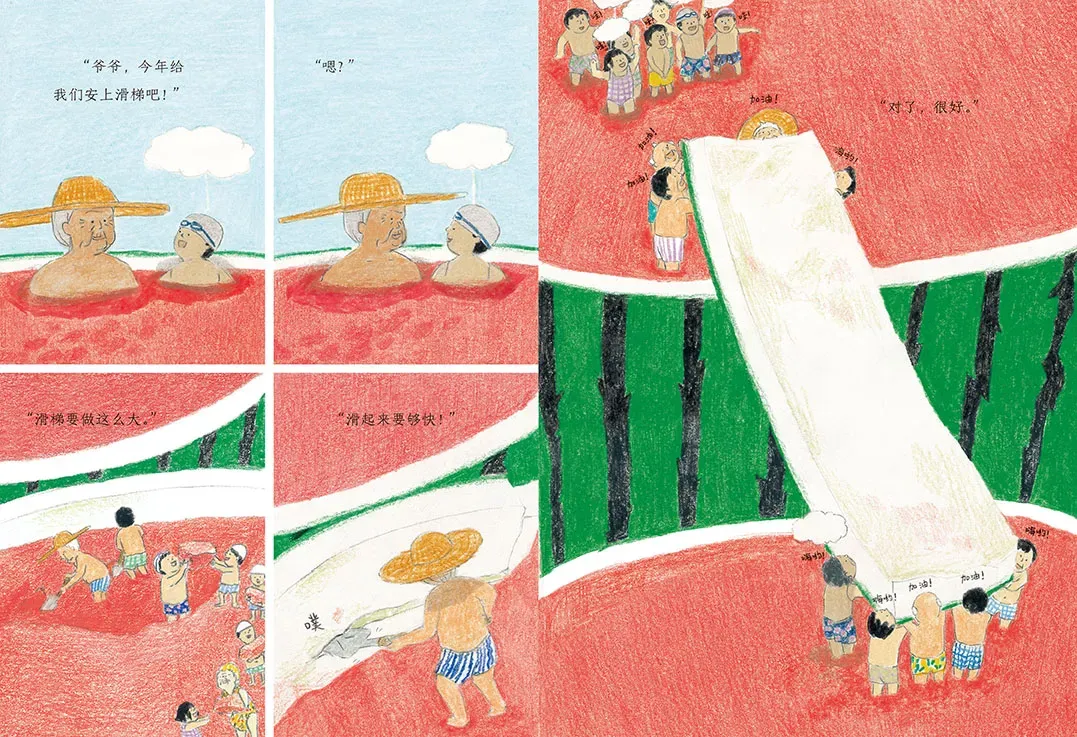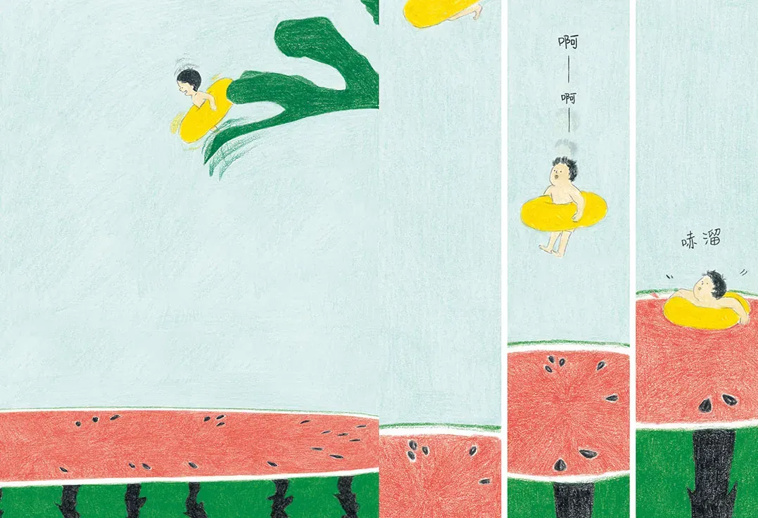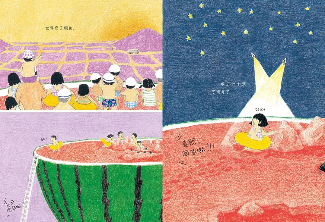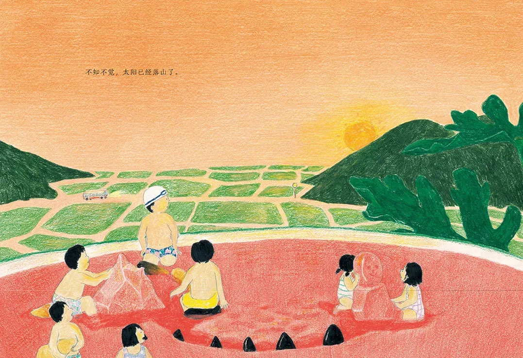 小伙伴们等不及和大家一起了,就快快地跑进了游泳场,脚踩着西瓜发出“沙沙沙”的声响。是快乐的声音也是夏天的声音。