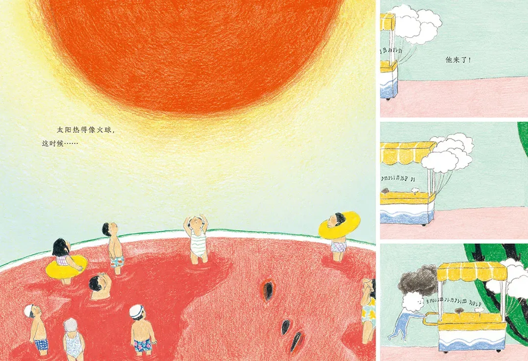 到了中午,太阳像个大火球,阳光晒得大家热得实在受不了。这时候......精明的云朵商人哼着歌推着它的云朵车,来到了西瓜游泳场下。