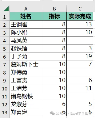 计算下图 1 中所有人的总完成率,C 列为空的人不用参与计算,即不需要将他们的指标计入总计。