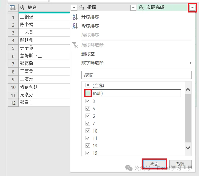 3. 点击“实际完成”右边的按钮 --> 在弹出的菜单中取消勾选“(null)”--> 点击“确定”