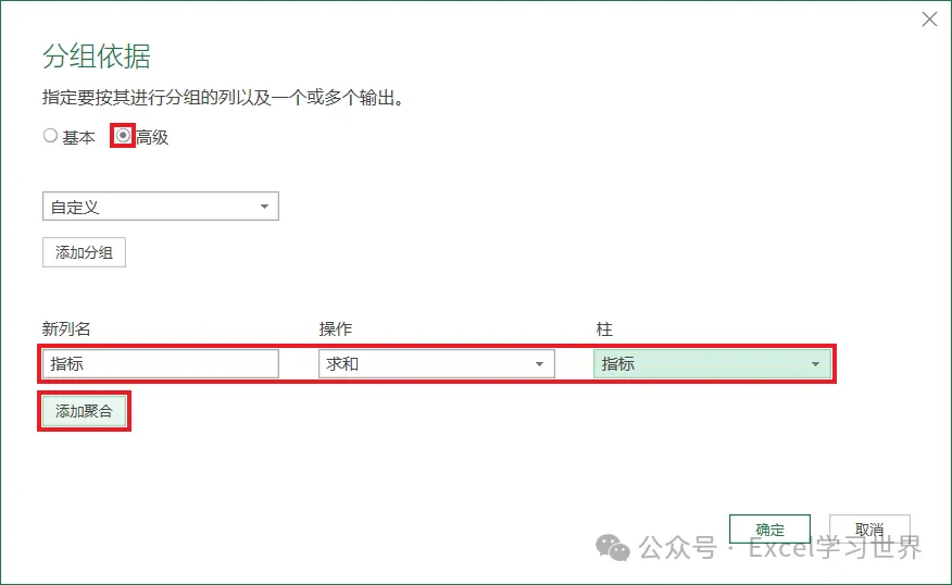 7. 在弹出的对话框中按以下方式设置 --> 点击“添加聚合”按钮: