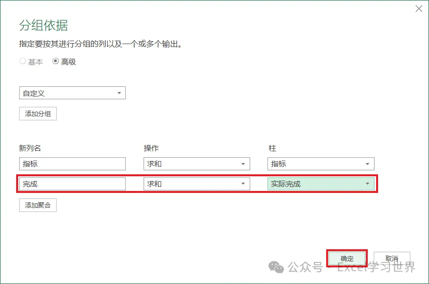 8. 在新出现的一行聚合项中按如下方式设置 --> 点击“确定”: