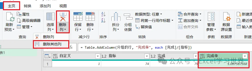 11. 选中“完成率”列 --> 选择菜单栏的“主页”-->“删除列”-->“删除其他列”