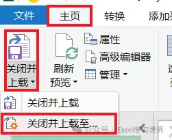 12. 选择菜单栏的“主页”-->“关闭并上载”-->“关闭并上载至”