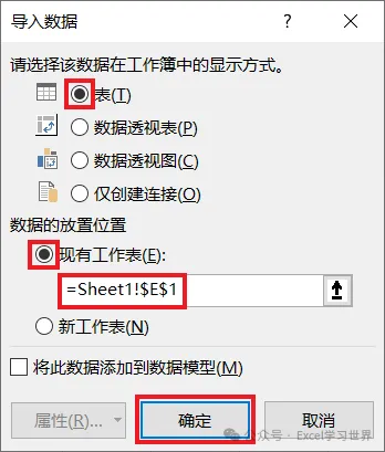 13. 在弹出的对话框中选择“表”--> 选择“现有工作表”及所需上传至的位置 --> 点击“确定”