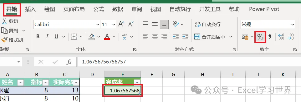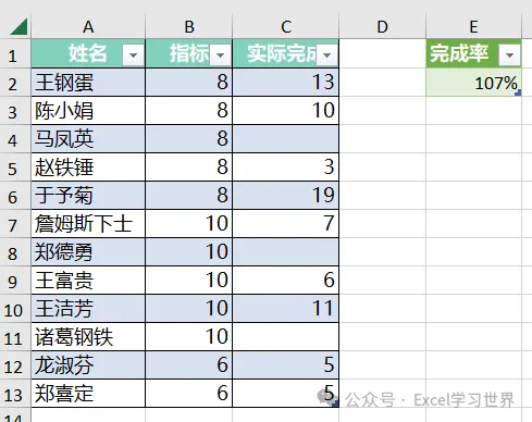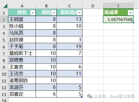 新列名:输入“完成率”
