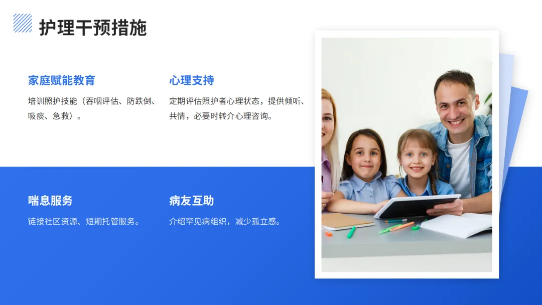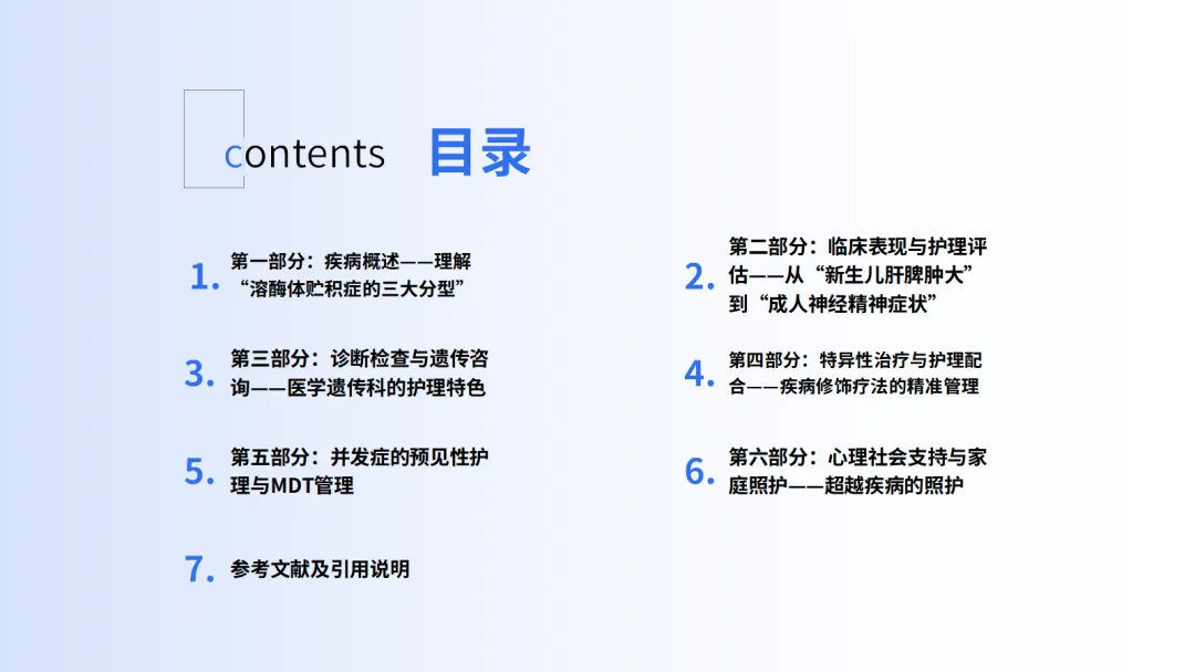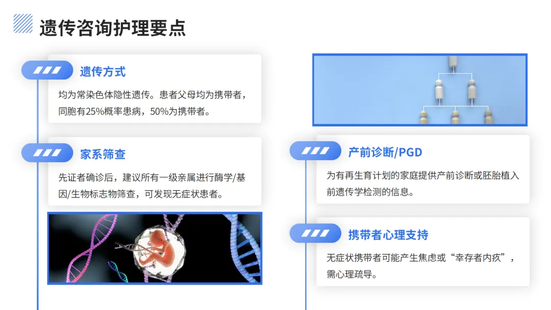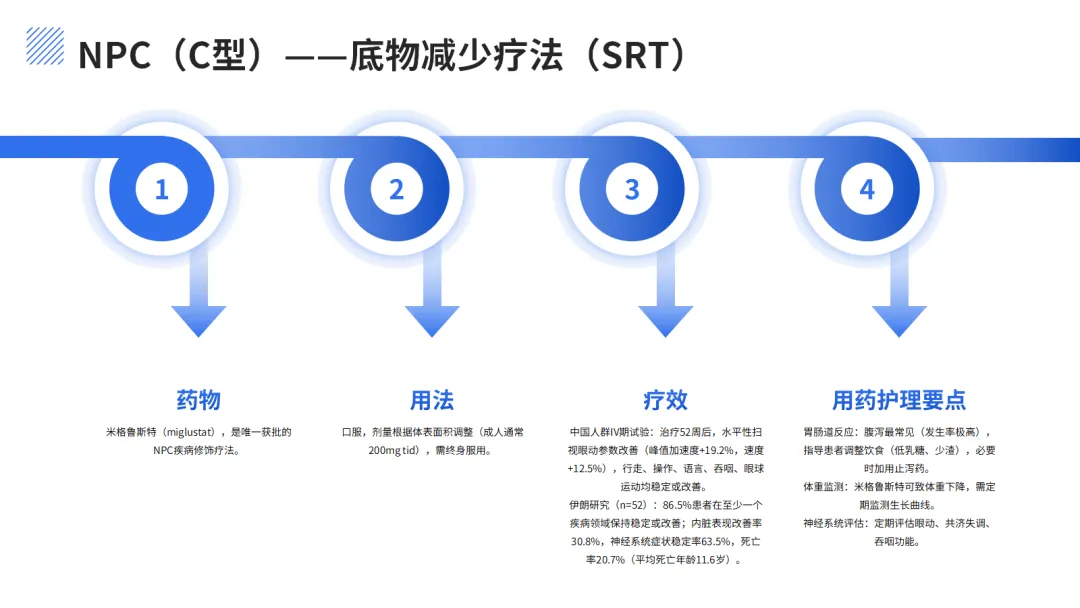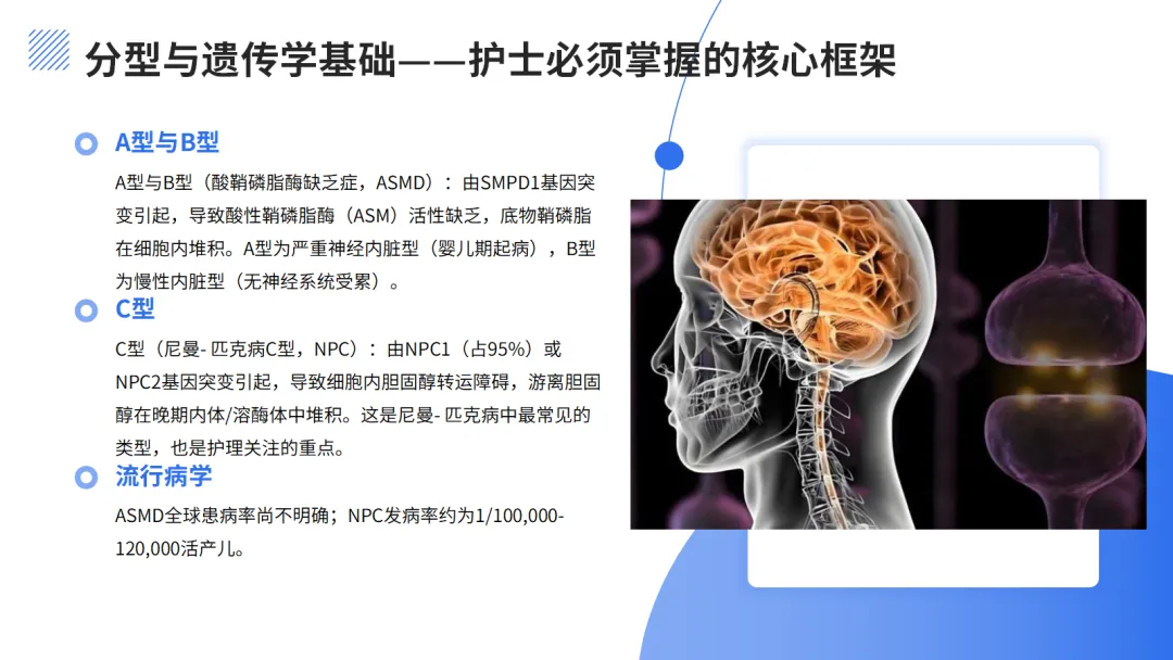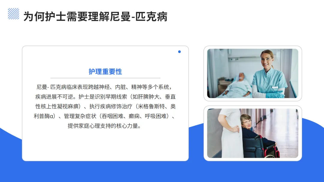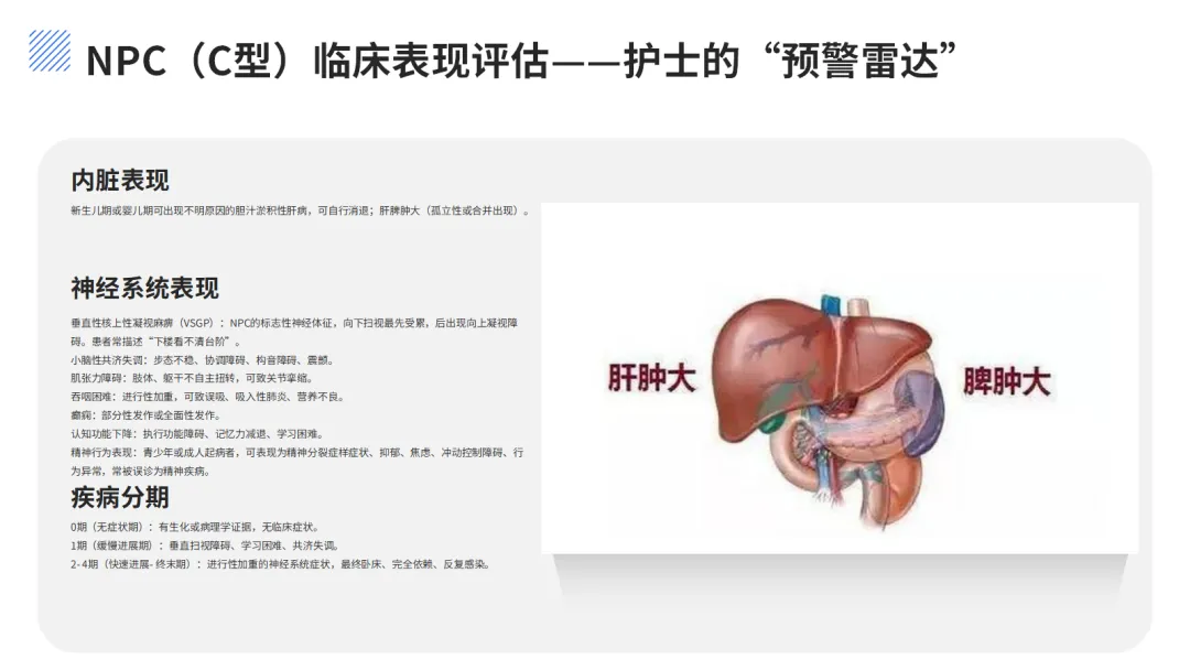 护理的重要性:尼曼- 匹克病临床表现跨越神经、内脏、精神等多个系统,疾病进展不可逆。护士是识别早期线索(如肝脾肿大、垂直性核上性凝视麻痹)、执行疾病修饰治疗(米格鲁斯特、奥利普酶α)、管理复杂症状(吞咽困难、癫痫、呼吸困难)、提供家庭心理支持的核心力量。