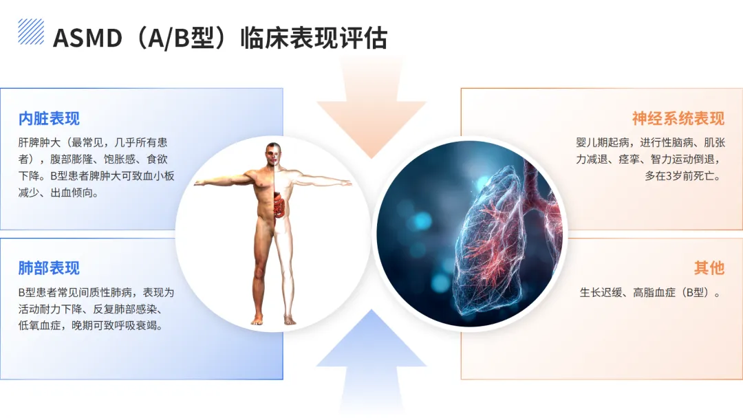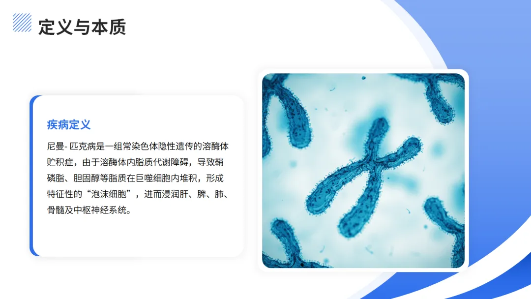摘要:尼曼- 匹克病是一组常染色体隐性遗传的溶酶体贮积症,由于溶酶体内脂质代谢障碍,导致鞘磷脂、胆固醇等脂质在巨噬细胞内堆积,形成特征性的“泡沫细胞”,进而浸润肝、脾、肺、骨髓及中枢神经系统。