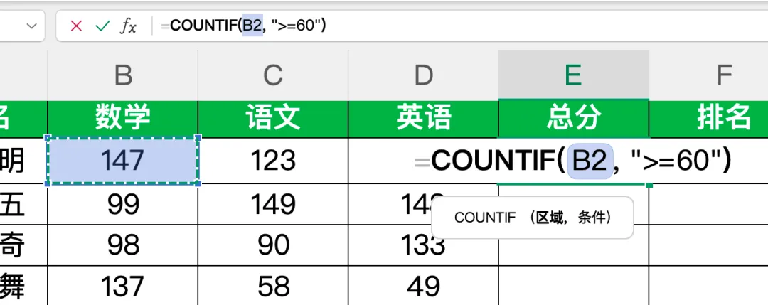 统计条件必须加英文双引号,如">=60",缺少引号公式会报错;