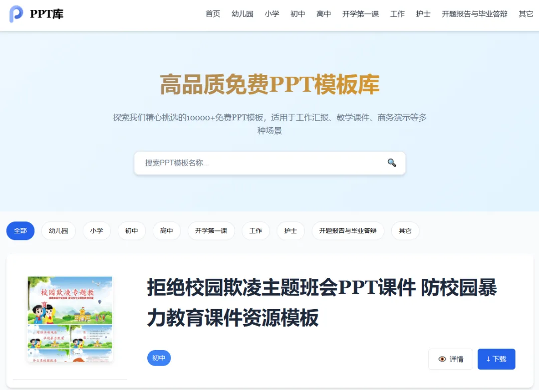 这是一个提供高品质免费PPT模板的网站,可以在这里找到超过10000种不同类型的PPT模板,适用于各种场合,如工作汇报、教学课件和商务演示等 #PPT#模板