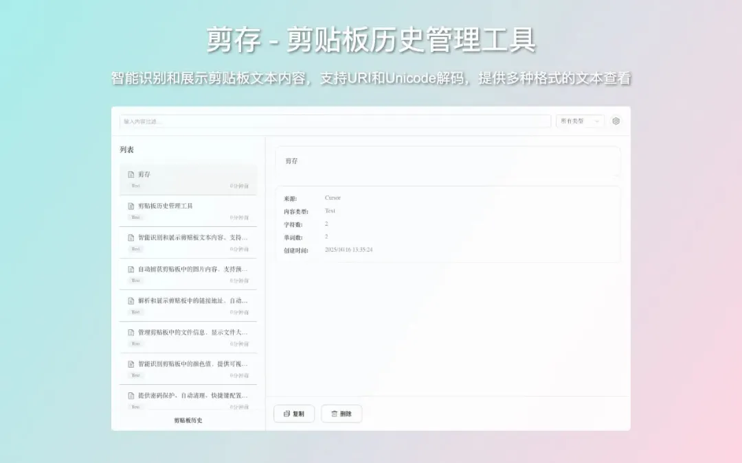 这是一款功能全面的剪贴板增强工具,它将剪贴板中原本“看不见”的数据形态转化为可视化、可操作的信息面板,让每一次复制都变得清晰可控。在文本处理方面,它能智能识别剪贴板中的文本内容,支持URI解码和Unicode解码,并提供多种格式的查看方式;对于文件信息,它可以展示文件大小、路径等详细属性,并支持在Finder中一键定位。图片功能尤为实用,它能自动捕获剪贴板中的图片,支持二维码识别、缩放预览和保存到本地;当复制的是链接时,软件会自动解析URL参数并以表格形式呈现,同时支持在浏览器中快速打开。颜色识别功能则能智能提取剪贴板中的色值,提供可视化预览和格式转换,方便设计师快速取色。此外,软件还提供了密码保护、自动清理、快捷键配置等个性化设置选项,在保障隐私安全的同时,让用户可以依照自己的使用习惯进行定制。无论是程序员调试、设计师取色,还是普通用户管理复制内容,这款工具都能大幅提升剪贴板的使用效率 #剪贴板#小崔啥都有