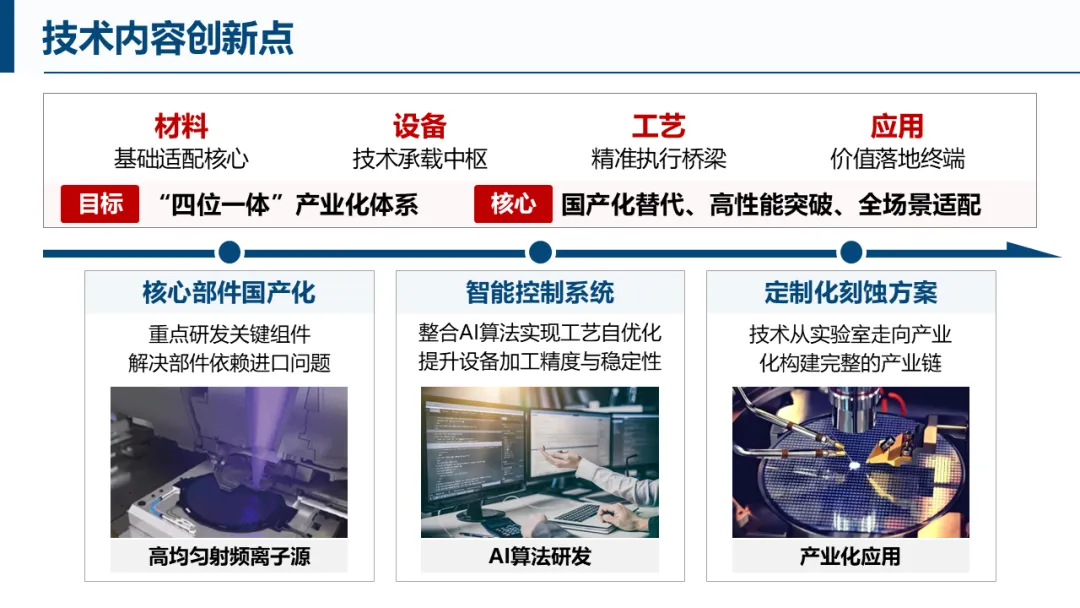 - 总体思路:构建“材料-设备-工艺-应用”四位一体产业化体系,以国产化替代、高性能突破、全场景适配为核心目标,从核心部件国产化、AI算法研发、定制化刻蚀方案、产业化应用四大方向突破。