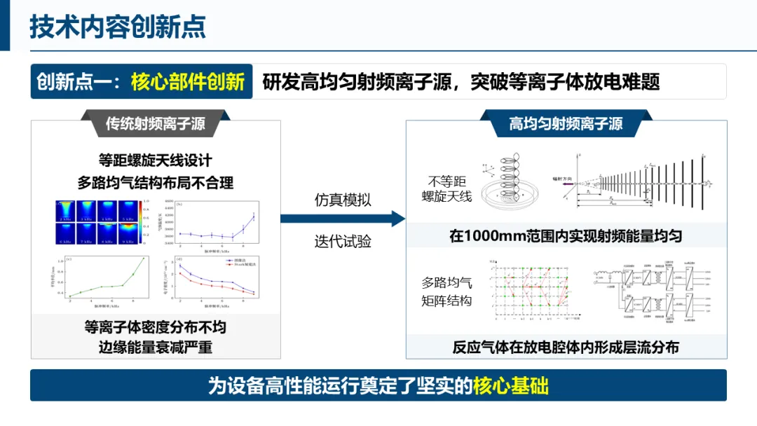 项目实现三大核心创新,打破技术壁垒,推动设备向高性能、智能化发展:- 核心部件创新:研发高均匀射频离子源,通过不等距螺旋天线、多路均气矩阵结构设计,解决传统离子源等离子体密度不均、边缘能量衰减问题,在1000mm范围内实现射频能量均匀,为设备高性能运行奠定基础。