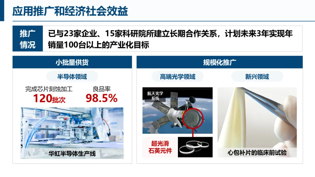 - 应用推广范围广、效果佳:已与23家企业、15家科研院所建立长期合作,实现小批量供货并计划未来3年规模化推广;在半导体领域完成120批次芯片刻蚀加工,良品率达98.5%,还应用于高端光学(航天光学系统超光滑石英元件)、生物医药(心包补片临床前试验)等新兴领域。