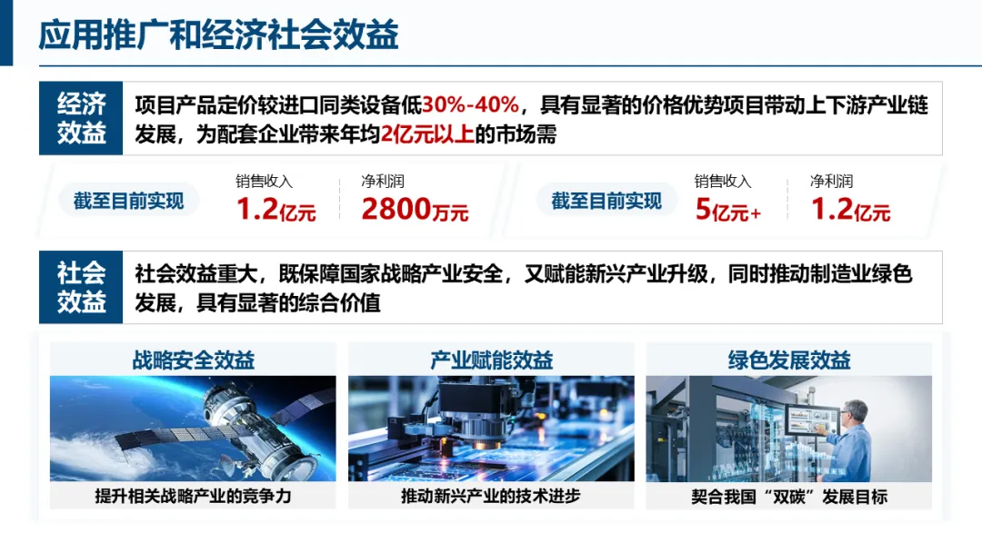 - 经济效益显著:产品定价较进口同类设备低30%-40%,价格优势明显;截至目前实现销售收入1.2亿元、净利润2800万元,未来预计销售收入超5亿元、净利润1.2亿元;带动上下游产业链发展,为配套企业带来年均2亿元以上市场需求。
