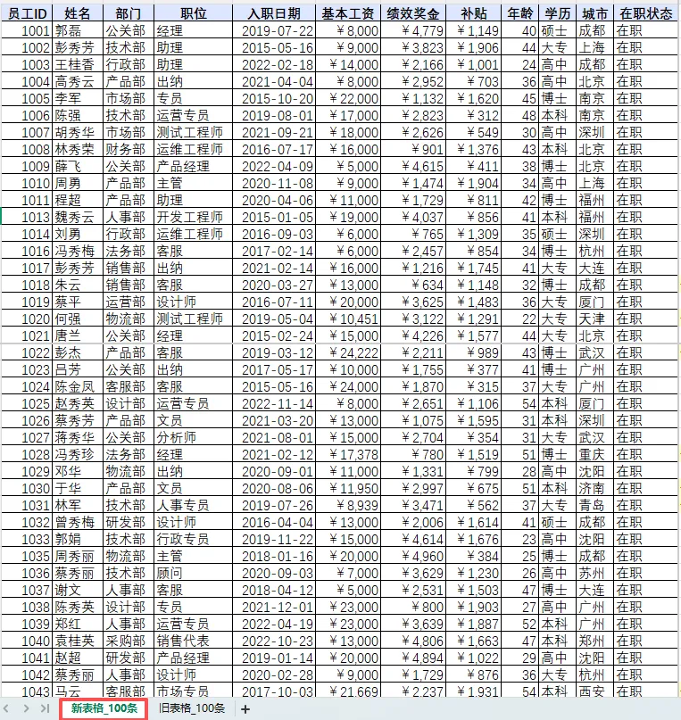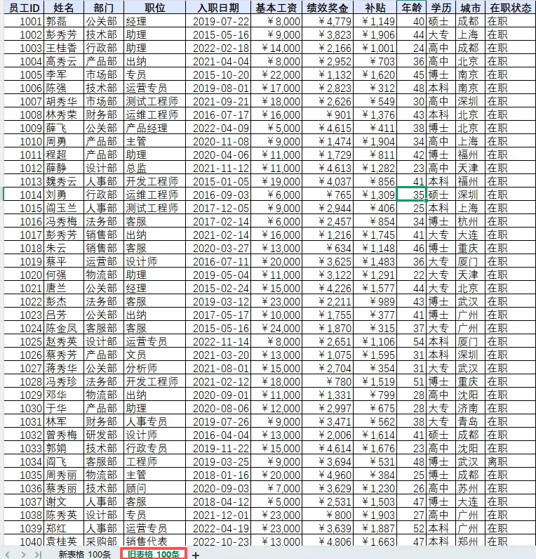 我们打开一个Excel文件,里面存在两个工作表,命名为“旧表格_100条”和“新表格_100条”