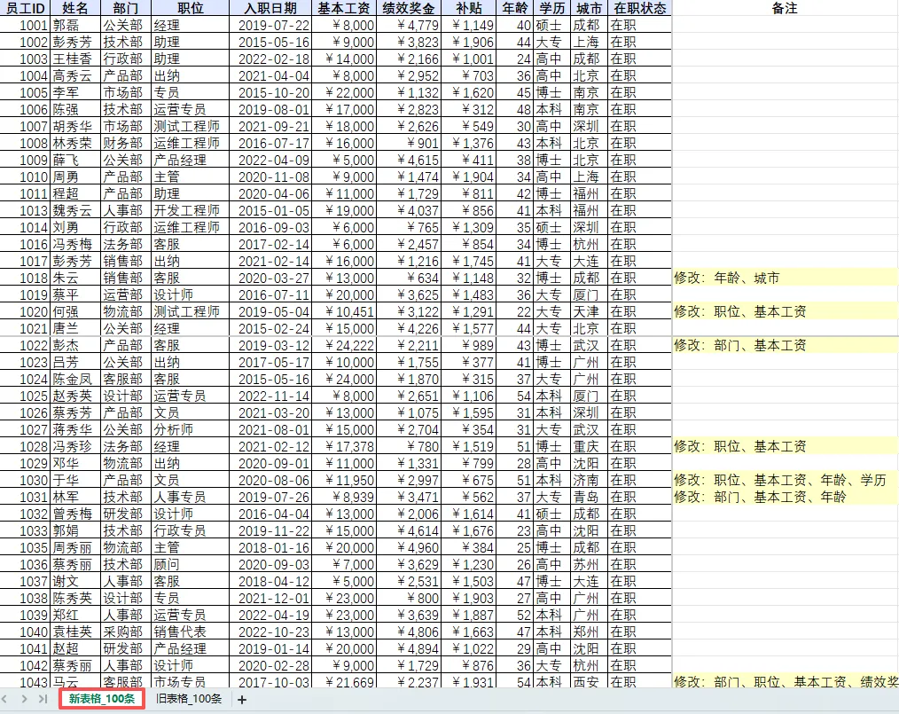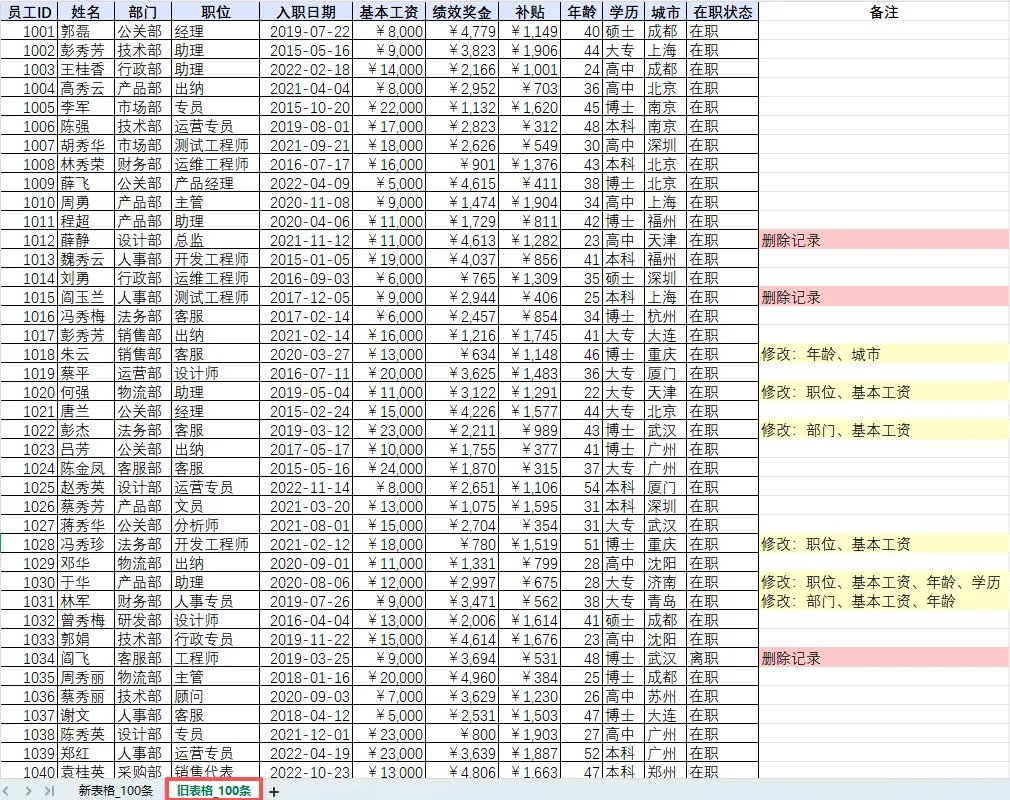 它会对两张表格(比如“旧表格_100条”和“新表格_100条”)进行智能对比,并在每一行后面自动添加“备注”列,告诉你:
