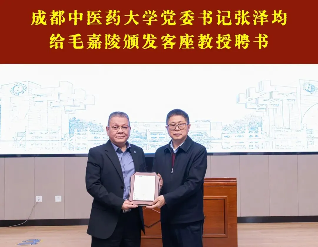 讲座前,成都中医药大学党委书记张泽均教授给毛嘉陵颁发客座教授聘书。成都中医药大学对外合作处处长佟枫主持了聘书颁发仪式。