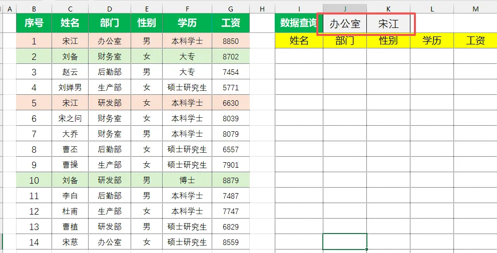 假设数据区域:C2:G15(含部门、姓名、薪资、岗位等目标信息)