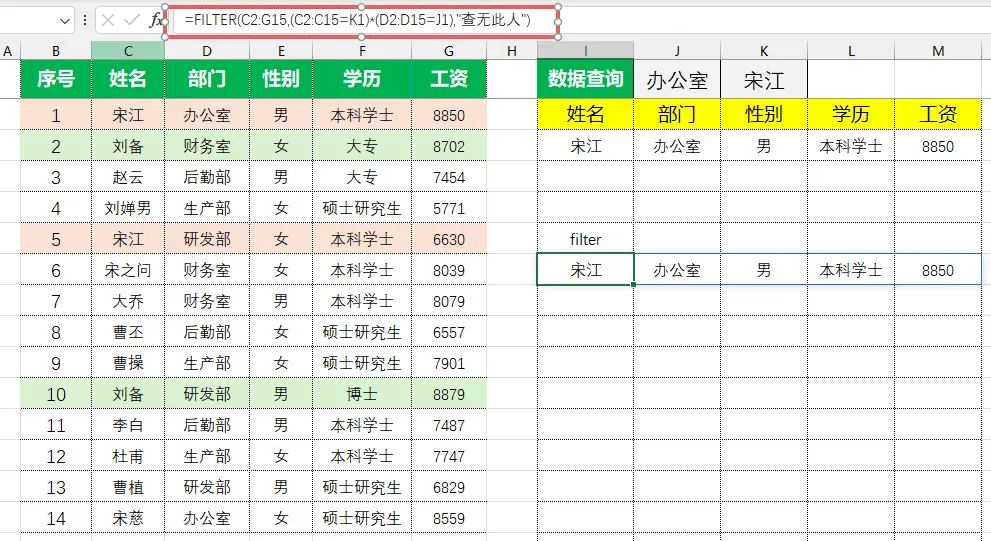 =FILTER(C2:C15,(C2:C15=K1)*(D2:D15=J1),"查无此人") 四、使用小贴士
