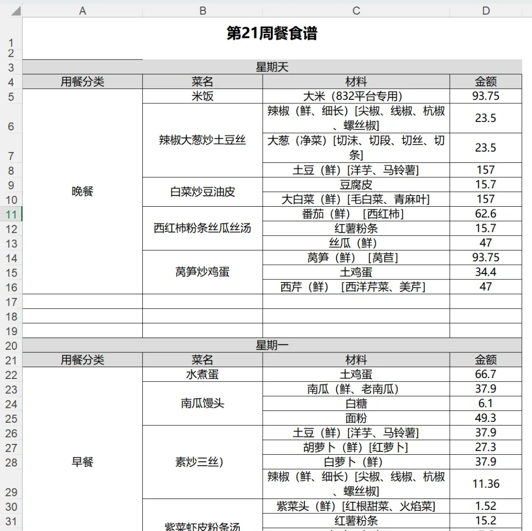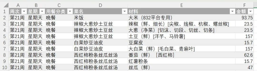 就是上面展示的那个格式:周次、星期、用餐分类、菜名、材料、金额,每行一条记录,不需要任何排版,不需要合并单元格,录入非常简单。