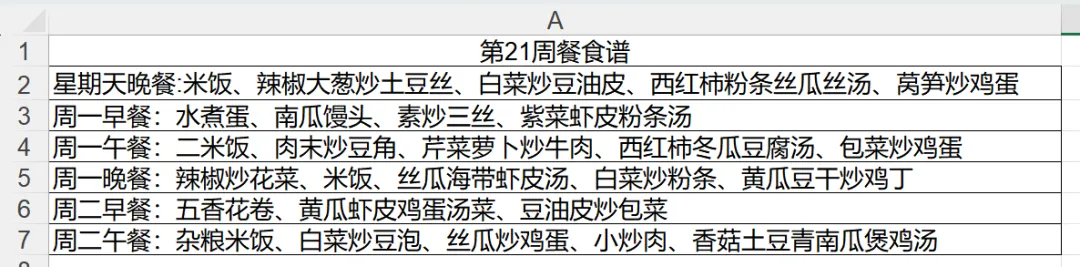 在Excel社区看到一个求助帖,发帖人说他有一个下图所示的每周的食谱表格: