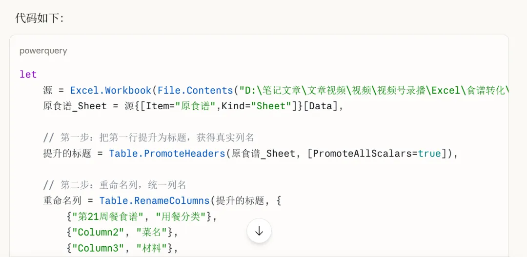 AI会直接给你一段代码。打开Excel → 数据 → 获取数据 → 来自文件 → 从Excel工作簿,加载数据后进入Power Query编辑器,点击【高级编辑器】,把代码粘贴进去运行。