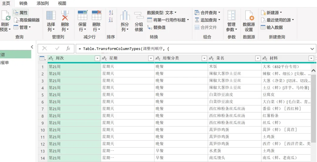 生成简洁汇总格式: 用Power Query分组汇总,每行一个用餐时段,菜名自动合并成一行。