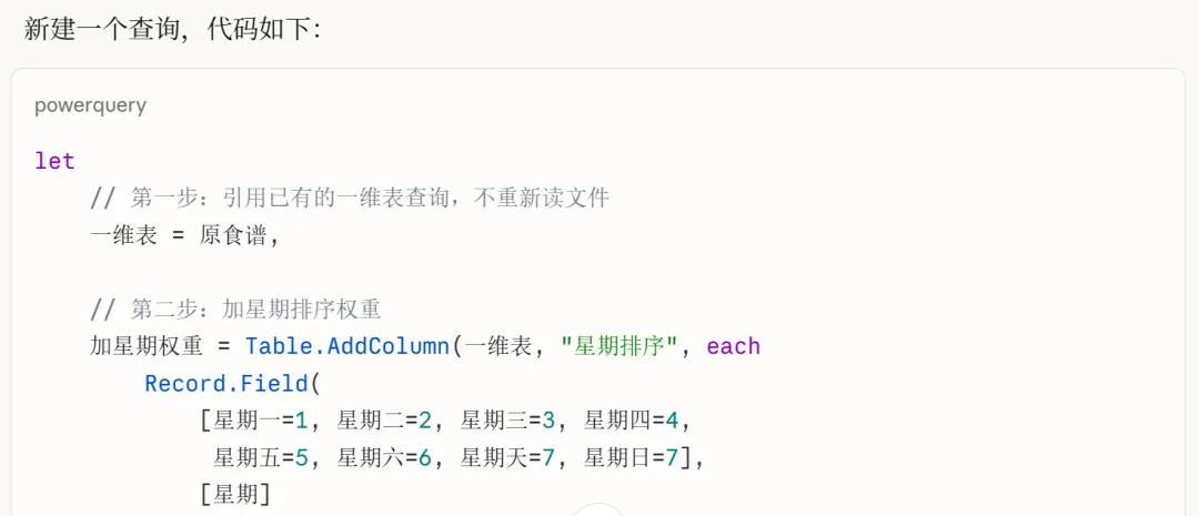 有了一维表之后,想要生成表格2的简易餐单,用函数来实现也会非常的困难,还是可以继续让Power Query生成。先新建一个空白查询,同样告诉AI: