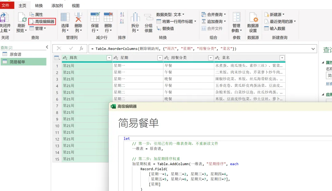 "我已经有了一张名为'原食谱'的一维表查询,包含周次、星期、用餐分类、菜名、材料、金额这几列。我想新建一个查询,引用这张一维表,按星期和用餐分类分组,把菜名用顿号合并成一行,并按星期一到星期日的顺序排列。请帮我生成Power Query代码。"