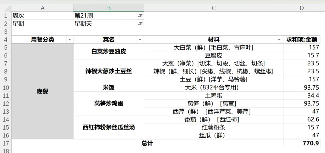 设置完成后,点击顶部筛选器选择"星期天",下面就只显示星期天的数据,格式和原来手工做的配餐表几乎一模一样,直接打印即可。