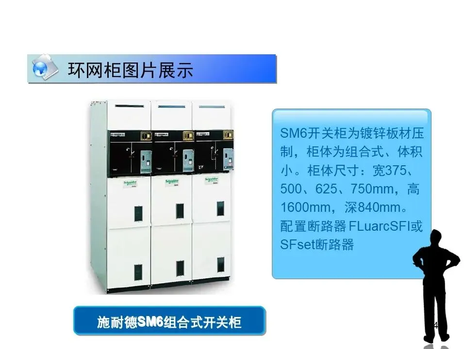 SM6开关柜为镀锌板材压制,柜体为组合式、体积小。柜体尺寸:宽375、500、625、750mm,高1600mm,深840mm。配置断路器 FLuarcSFI或SFset断路器