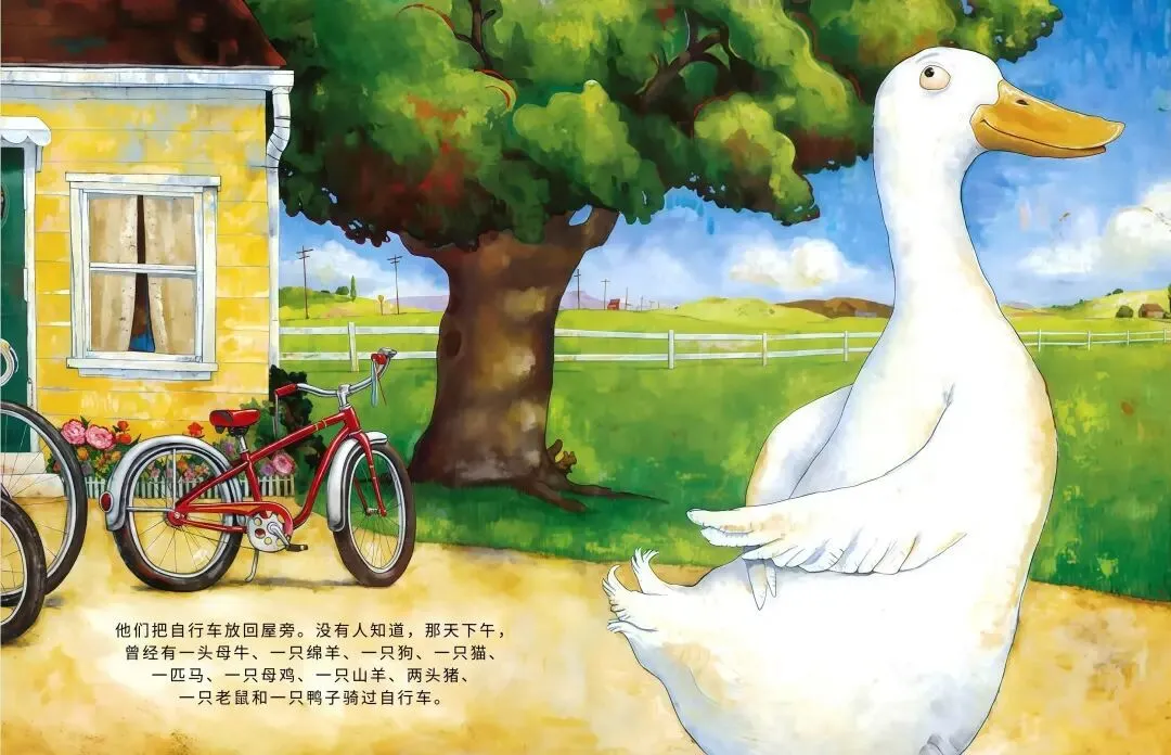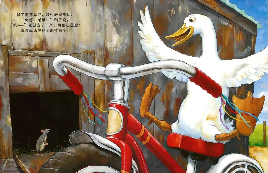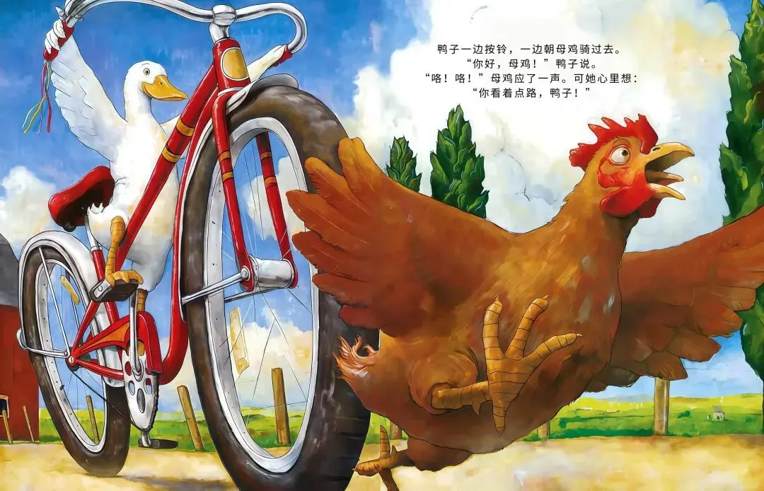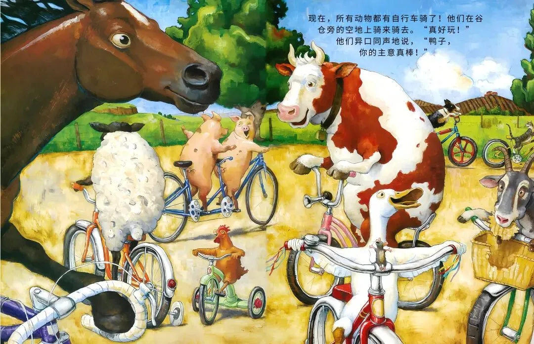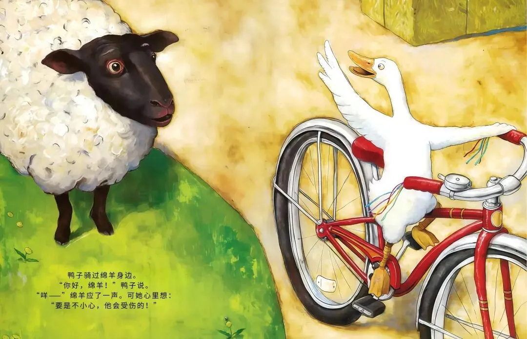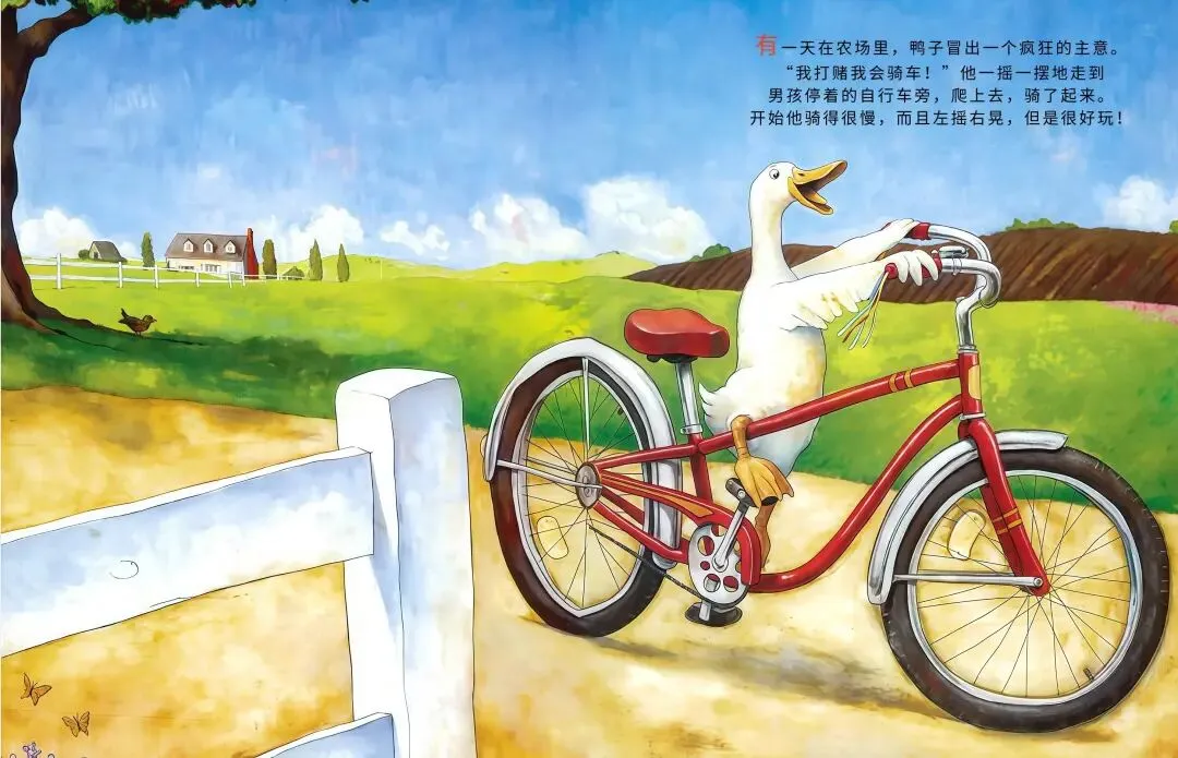 农场里的小鸭子突发奇想:我要骑车!它摇摇晃晃跨上自行车,一路和农场小伙伴们打招呼,母牛觉得愚蠢、绵羊满是担忧、猫咪不屑一顾…可鸭子不管旁人眼光,越骑越熟练,还解锁单脚骑车、撒开车把的超酷操作!最后孩子们离开后,所有动物都骑上自行车,一起感受追风的快乐,这趟勇敢尝试的旅程,超治愈~