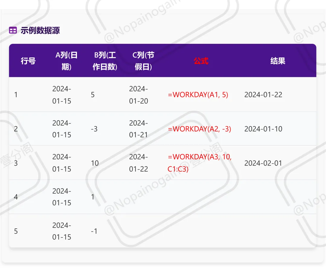 基本语法:=WORKDAY(start_date, days, [holidays])