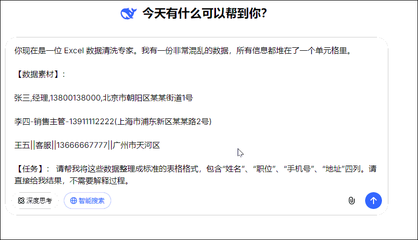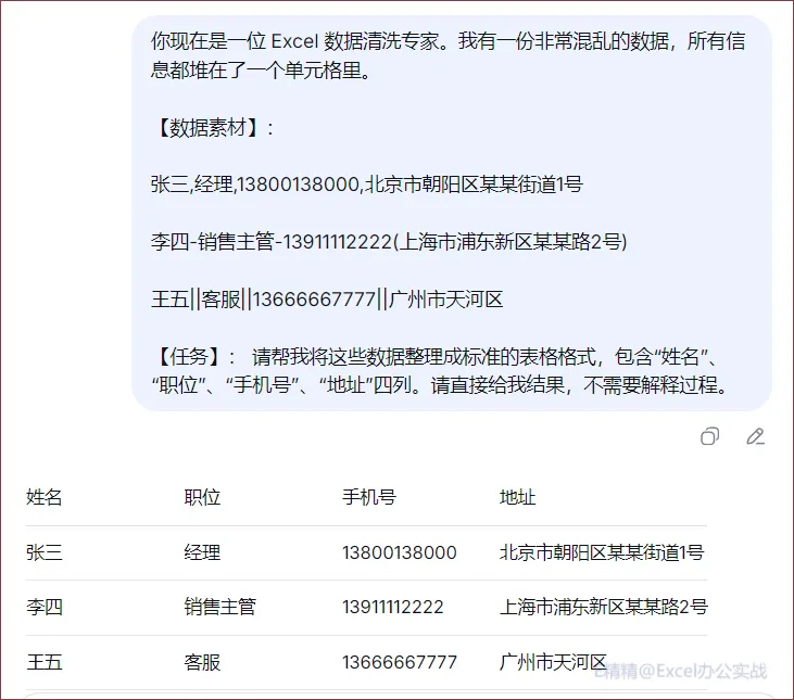 你现在是一位 Excel 数据清洗专家。我有一份非常混乱的数据,所有信息都堆在了一个单元格里。