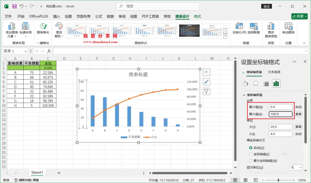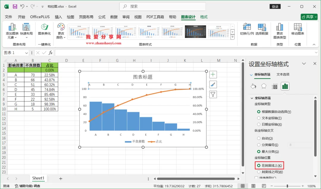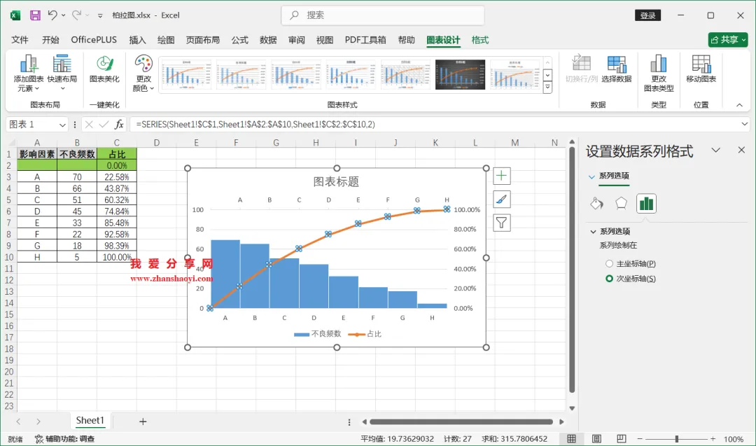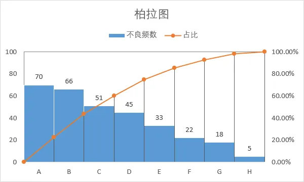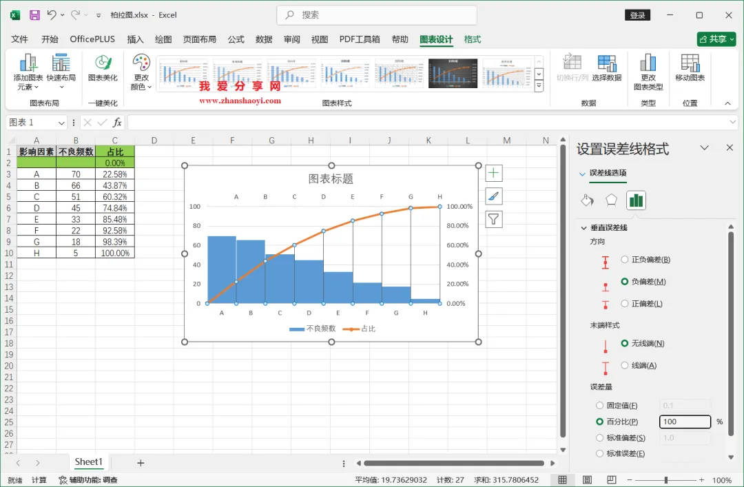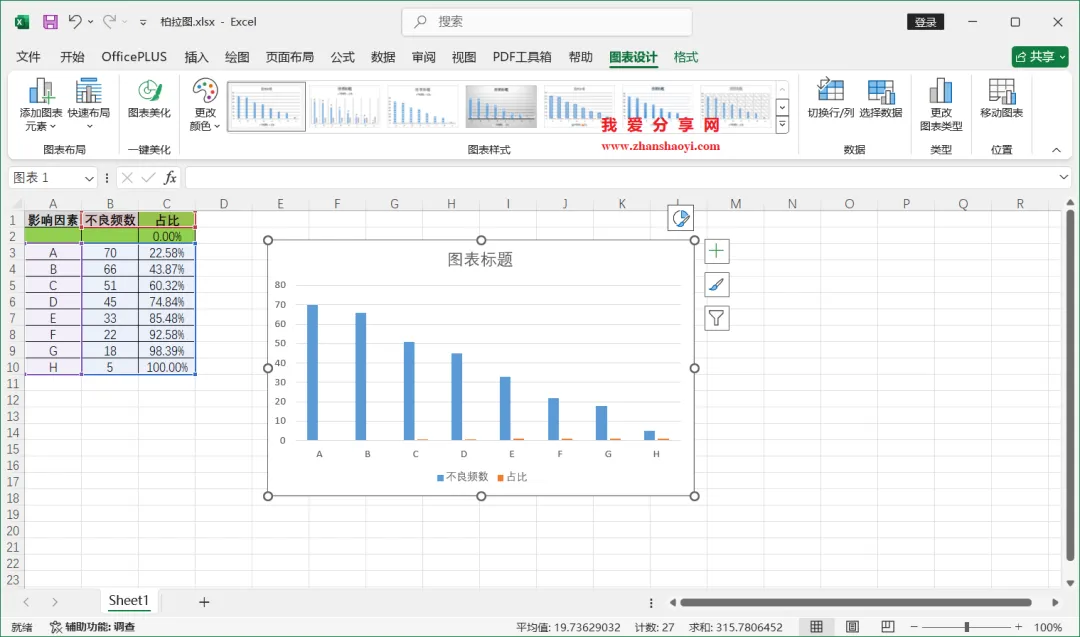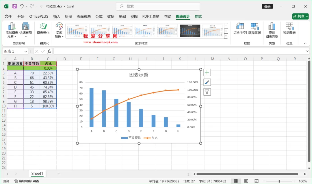 18、如下,柏拉图表格已经基本完成了,我们还可以进行一些美化;