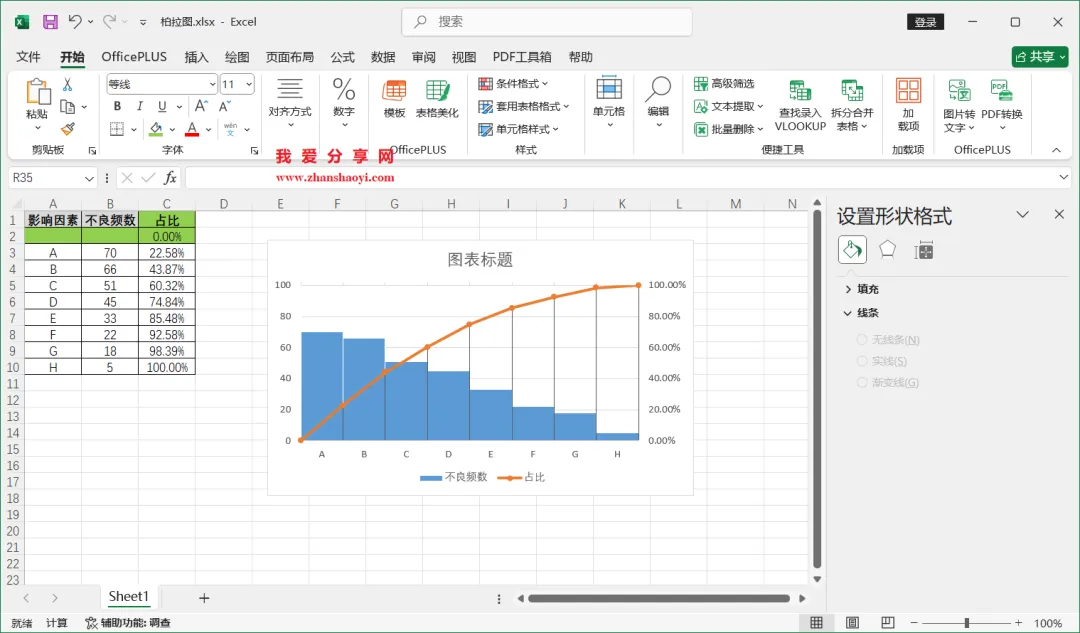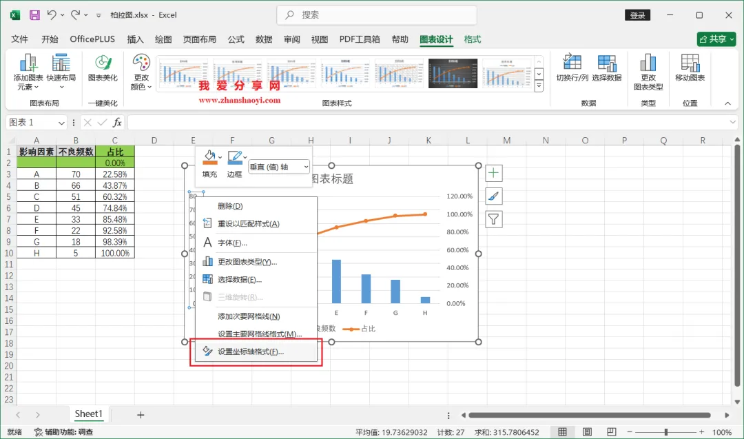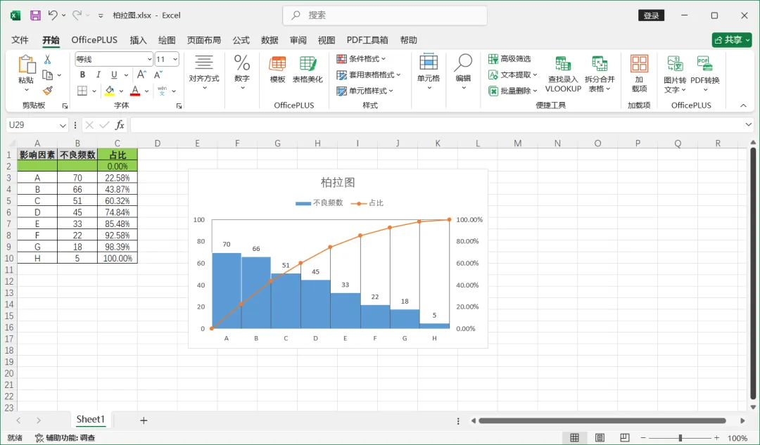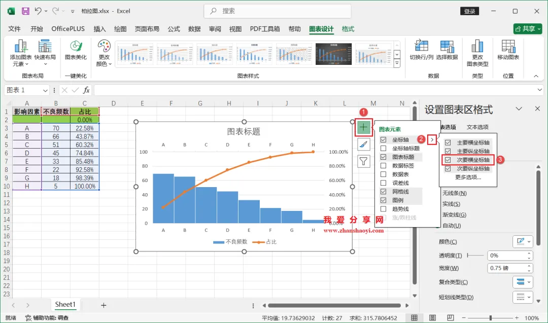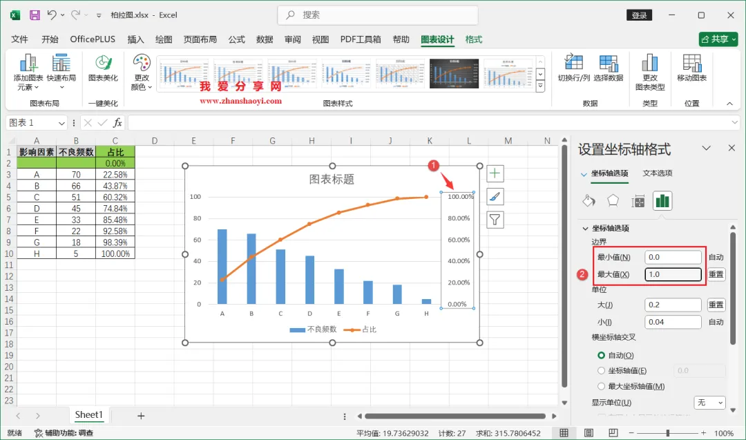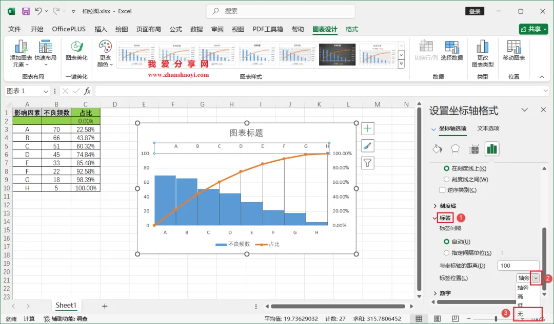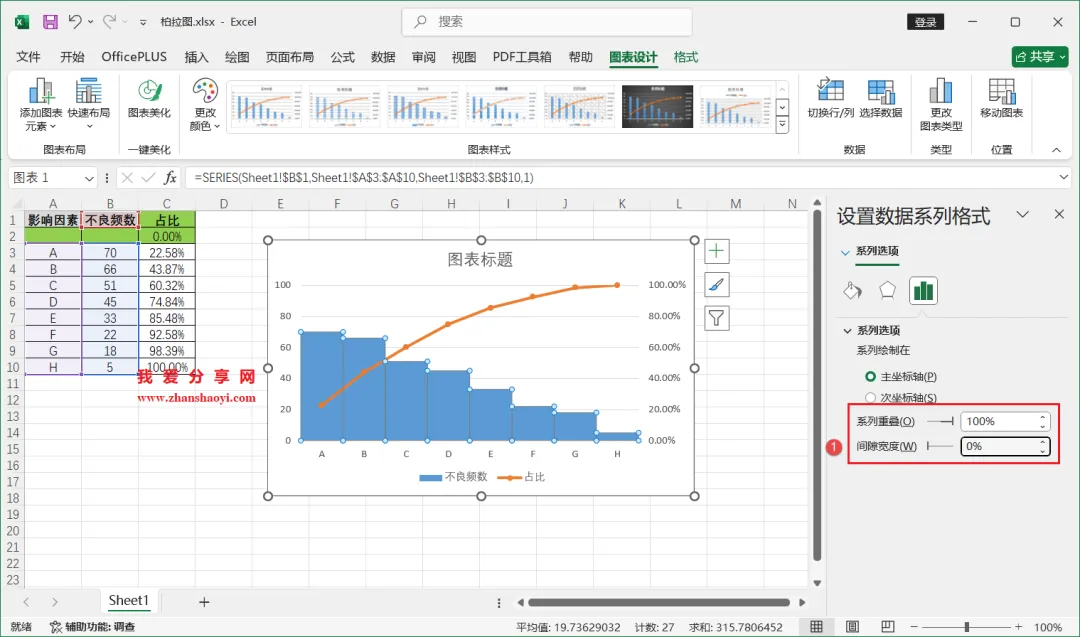18、如下,柏拉图表格已经基本完成了,我们还可以进行一些美化;