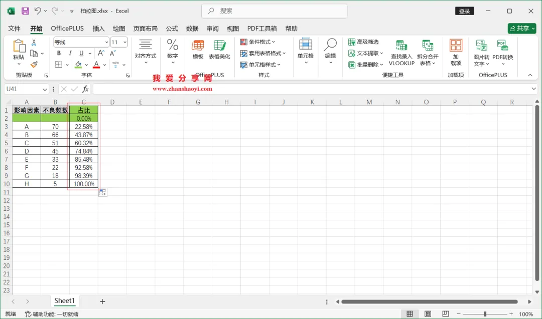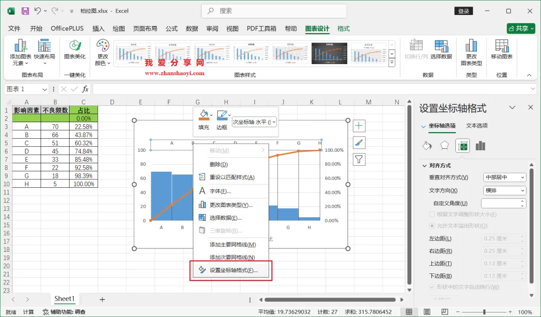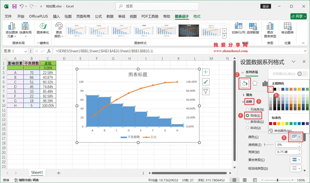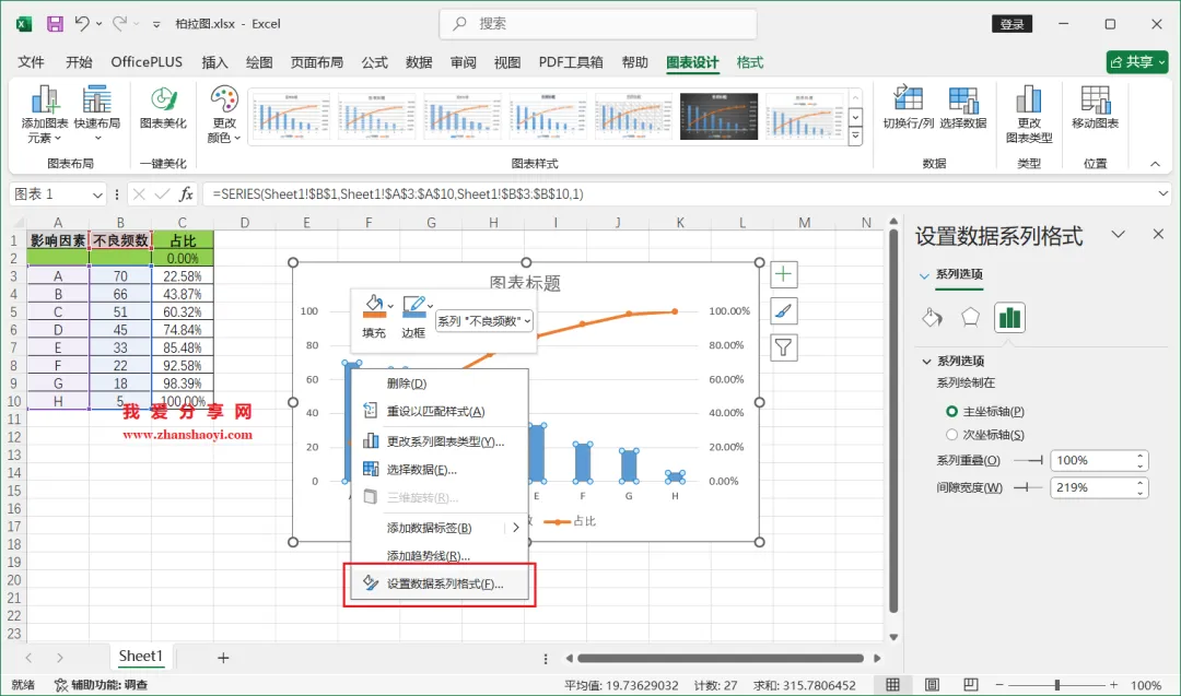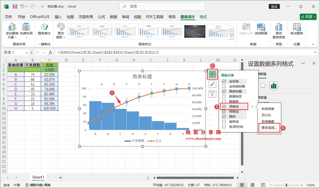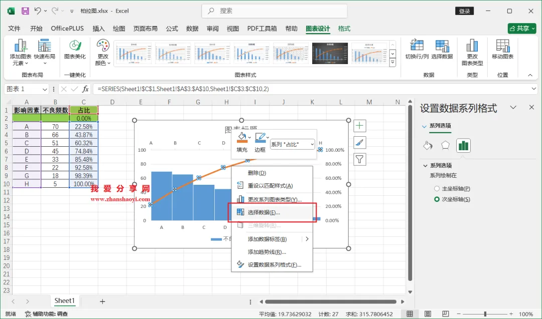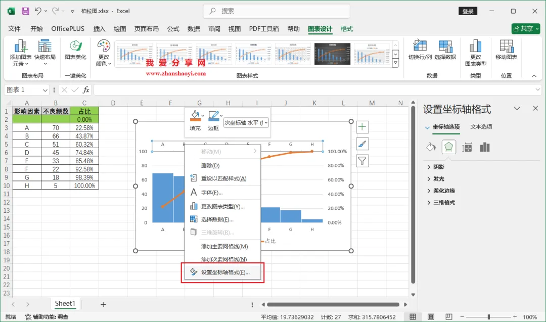 18、如下,柏拉图表格已经基本完成了,我们还可以进行一些美化;