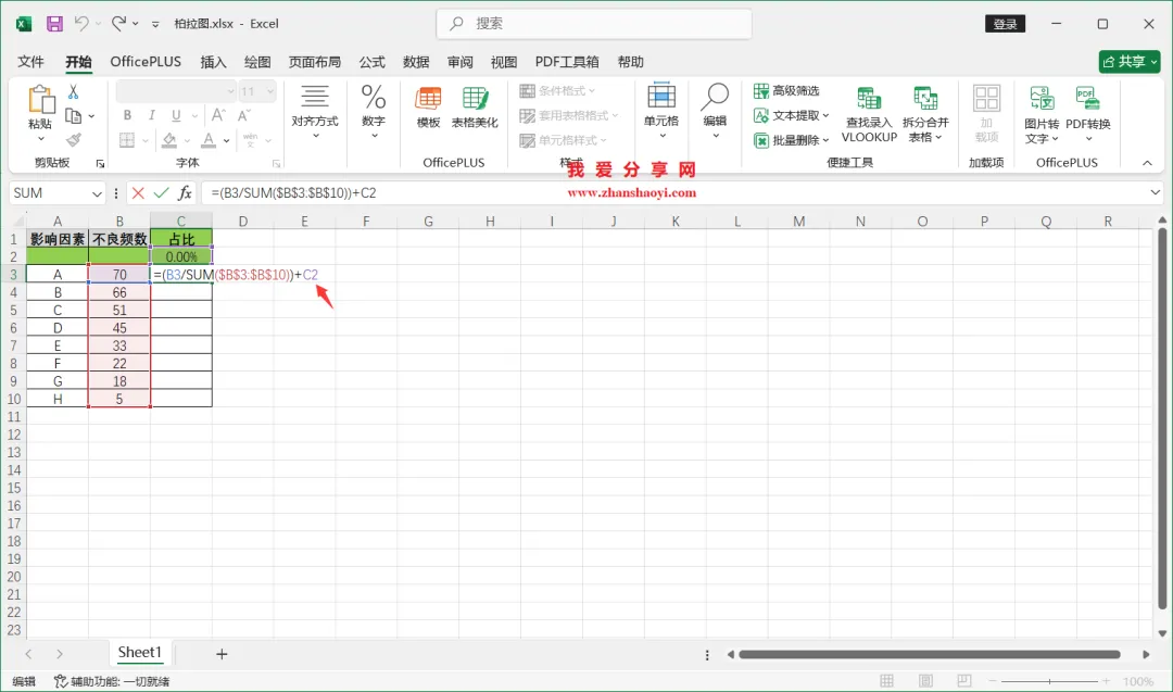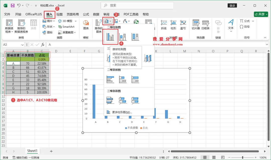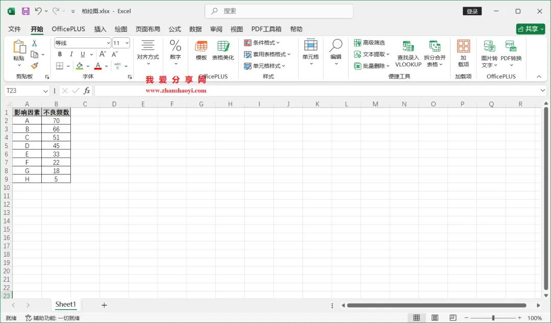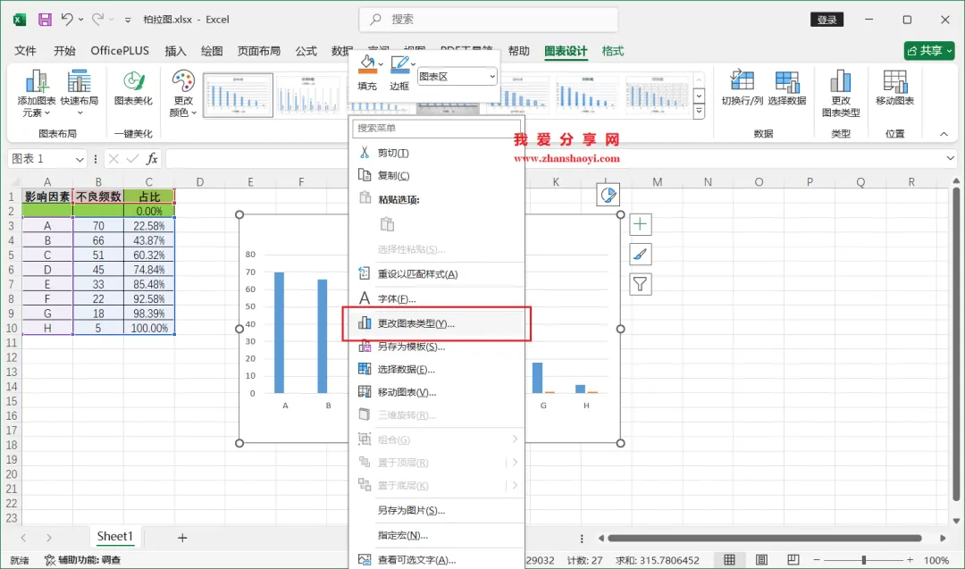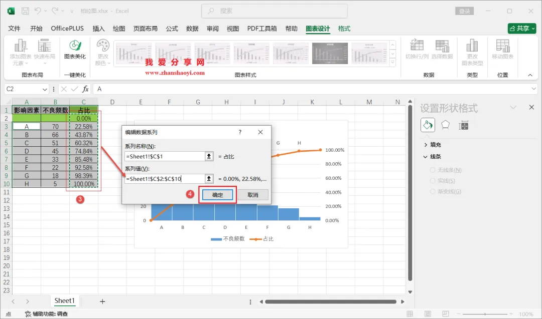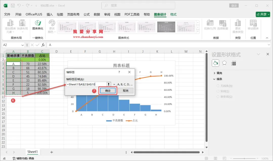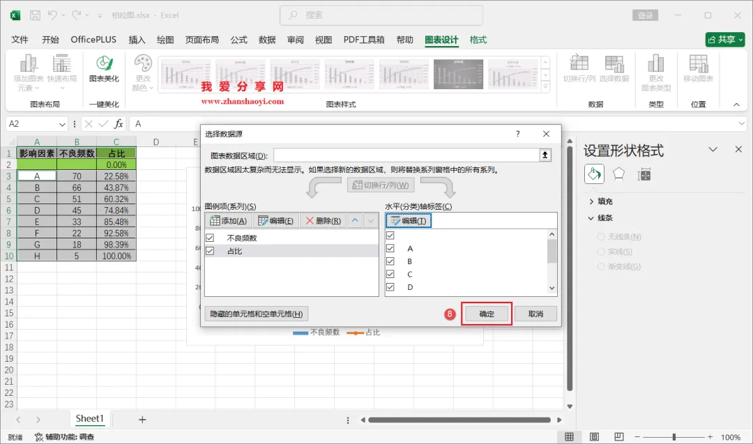 18、如下,柏拉图表格已经基本完成了,我们还可以进行一些美化;